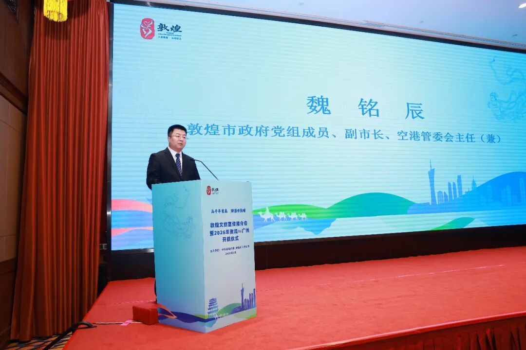 魏铭辰说,敦煌是古丝绸之路的“咽喉锁钥”与第一枢纽,四大文明在此交汇融合,广州作为千年商都,是粤港澳大湾区文旅发展核心枢纽,开放包容的城市气质与敦煌的丝路精神一脉相承。3月15日,敦煌=广州航线的正式开航,让“大漠孤烟直”的雄浑与“花城锦绣妍”的温婉完美邂逅,敦煌期待与大湾区深化合作,共同开发特色旅游线路、打造文旅融合精品、拓展客源共享市场,诚邀各界嘉宾乘新航线,赴敦煌之约,赏大漠风光、品千年莫高。