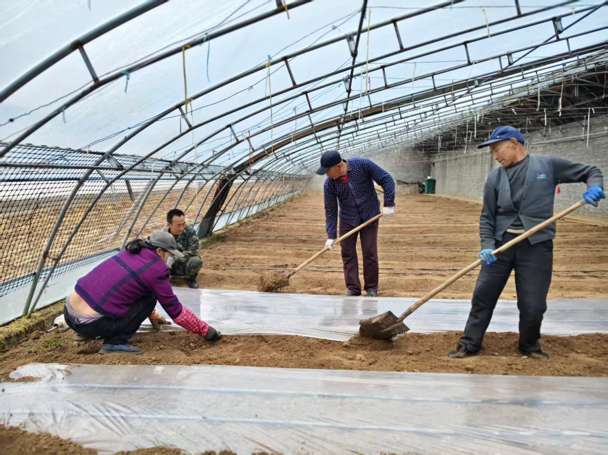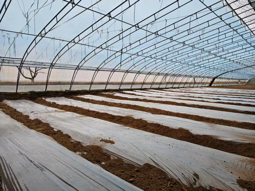 阳光透过大棚洒落在地面,新铺的地膜泛着银光,仿佛为土地披上“春装”。