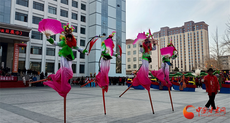演出场上,雄狮、金龙、高跷、春牛伴着春风舞动,太平鼓、唢呐、铜钹奏响新春旋律,生动再现了和政群众蒸蒸日上的幸福生活。演员们扮相精致、身姿灵动,高跷表演者彩扇轻摇、丝巾飞舞,尽显民间艺术的独特韵味。