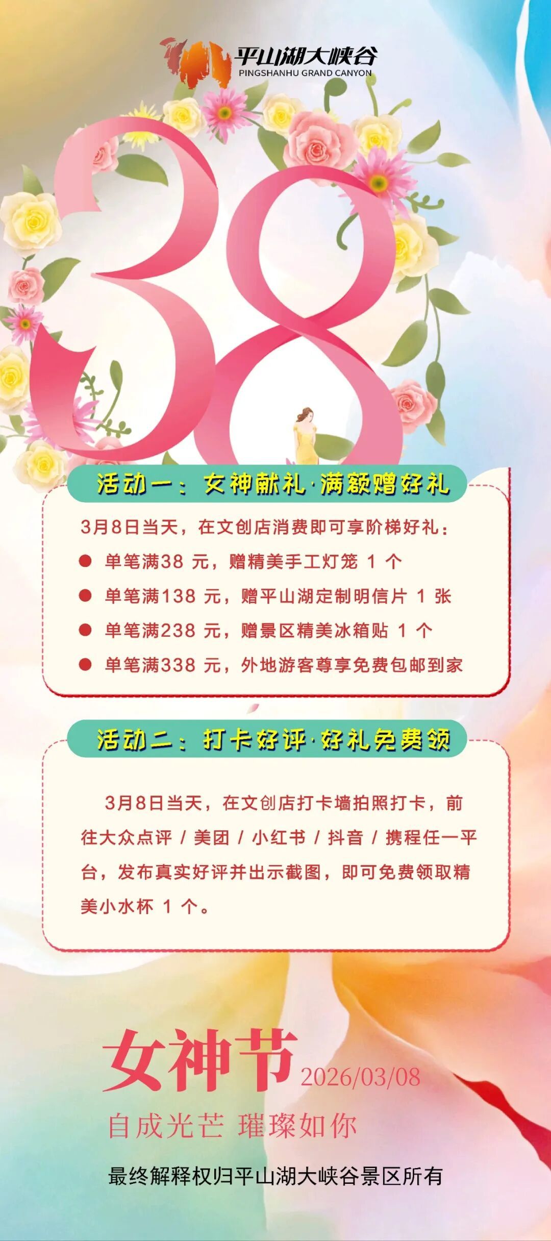 3月8日当天,前往文创店打卡墙定格美照在大众点评/美团/小红书/抖音/携程任一平台发布景区真实好评并出示截图即可免费领取精美小水杯1个实用好物,承包你的春日出行小美好~
