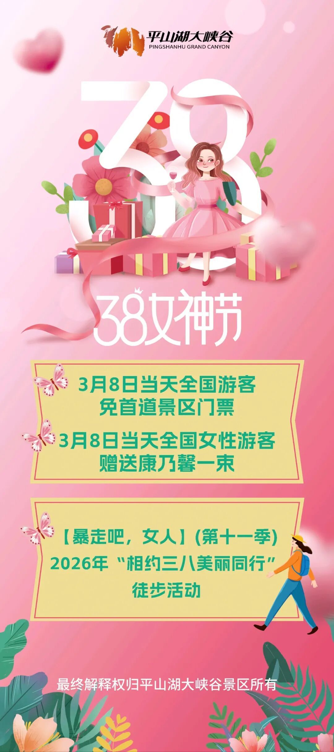 风送暖,芳华绽放在专属女性的美好节日里平山湖大峡谷以春光为礼,以美景为伴精心筹备五大女神专享主题活动还有超燃的「暴走吧,女人」徒步活动同步开启3月8日,邀各位女神奔赴峡谷解锁春日限定美好,尽享专属宠爱~