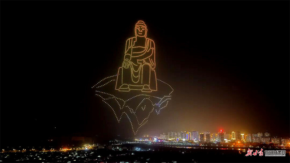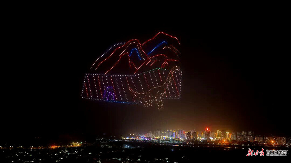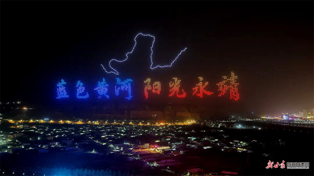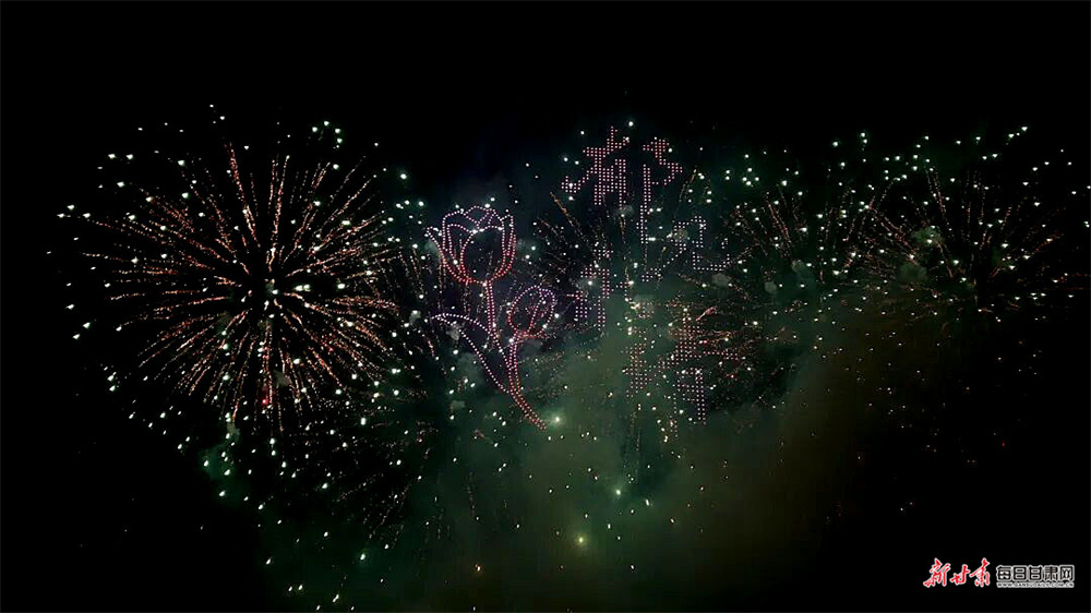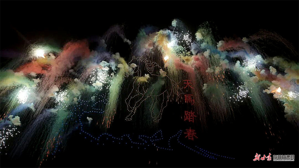夜幕下,1000架无人机凌空布阵,精准勾勒出马家窑彩陶、水车转轮等地域图腾,“蓝色黄河 阳光永靖”“马上来财”“炳灵史诗”等主题画卷次第铺展,生动诉说了千年文脉与时代新声。当无人机光影渐次落幕,五大篇章焰火应声升空,虚实交织,同框演绎。“天马踏春”“郁见永靖”等光影特效与焰火交相辉映,七彩焰火漫天绽放,黄河碧波与璀璨灯火相映成趣,完美呈现了科技与文化交融的视觉盛宴。