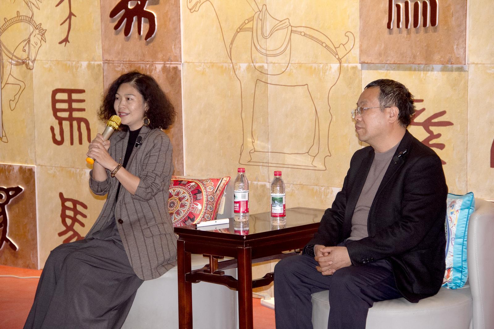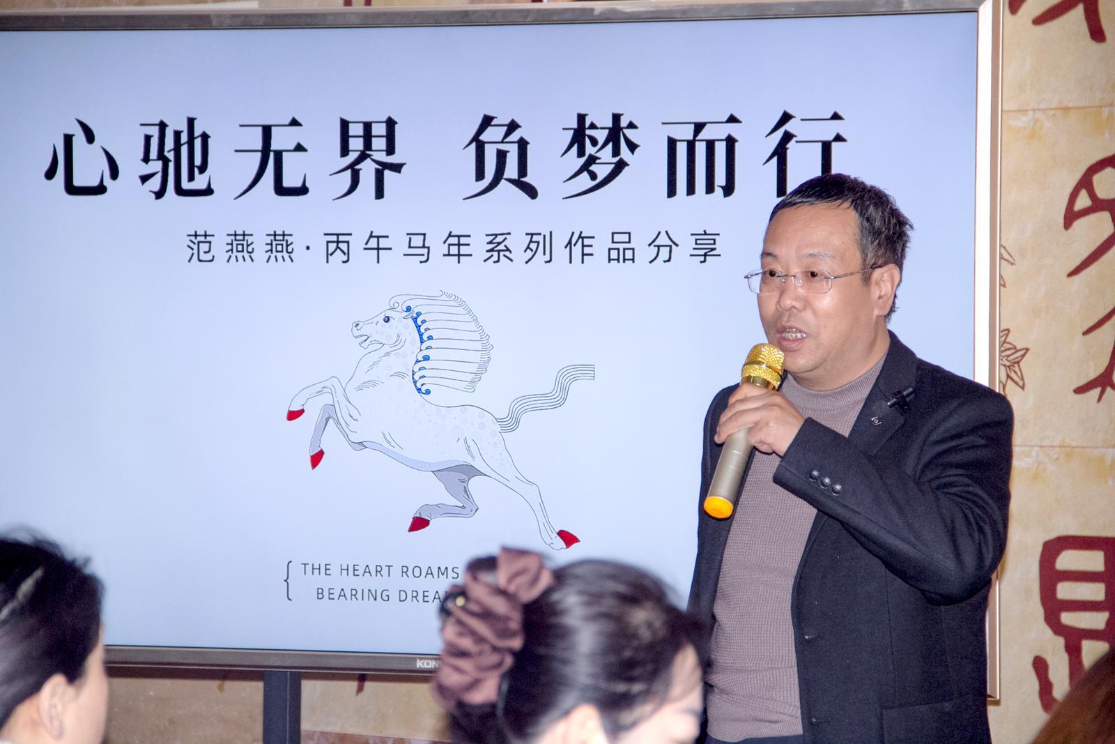 嘉宾交流环节,三位来自不同领域的代表分享了对范燕燕作品的感悟。嘉宾对作品《驰梦录》感触颇深:“画面中,被固定却眼神温存的马、静默的窗、仿佛血肉拼搏的痕迹、乘着祥云腾空的小马--这一切让我看到了人生的低谷与希望,如同梵高《星空》般复杂而充满力量。范老师用童话般的方式告诉我们:无论经历多少挫折,只要心中有光,终将迎来回报。”嘉宾从文旅工作者的视角,高度评价范燕燕对传统文化的当代转化:“作品将汉马图腾与敦煌色彩完美融合,既象征着时间的永恒与文明的轮回,更让丝路文化在当代实现了华丽转身。这种将传统符号转化为当代语言的努力,正是文化自信的生动体现。祝愿范老师的事业一马当先,也祝愿大家在马年马到成功!”嘉宾对马的形象有着天然的亲近:“在作品中,我看到了马的自由、奔放与坚定不移的信念,深受鼓舞。艺术家用诗意的语言展现了马的灵魂,那种穿越时空、跨越地域的力量直抵人心。希望我们在天马行空的想象中,依然能脚踏实地,稳步向前。”分享会的尾声,石明秀馆长做总结致辞。他深刻指出,范燕燕老师的艺术之所以打动人,在于她不止于形式上的创新,更在于她赋予作品深刻的哲学思考--从生命轮回、宇宙秩序到人类精神的终极意义。她以丝绸为载体,以马为意象,将对天地、人生、文明的思索融入每一幅作品中。