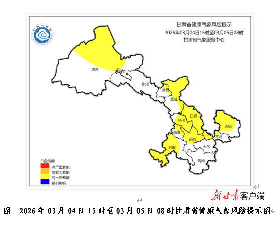 新甘肃客户端兰州3月4日讯(新甘肃·甘肃日报记者 王思璇)记者从甘肃省气象局获悉,甘肃省气象服务中心、甘肃省疾控中心今天下午发布甘肃省健康气象风险提示。