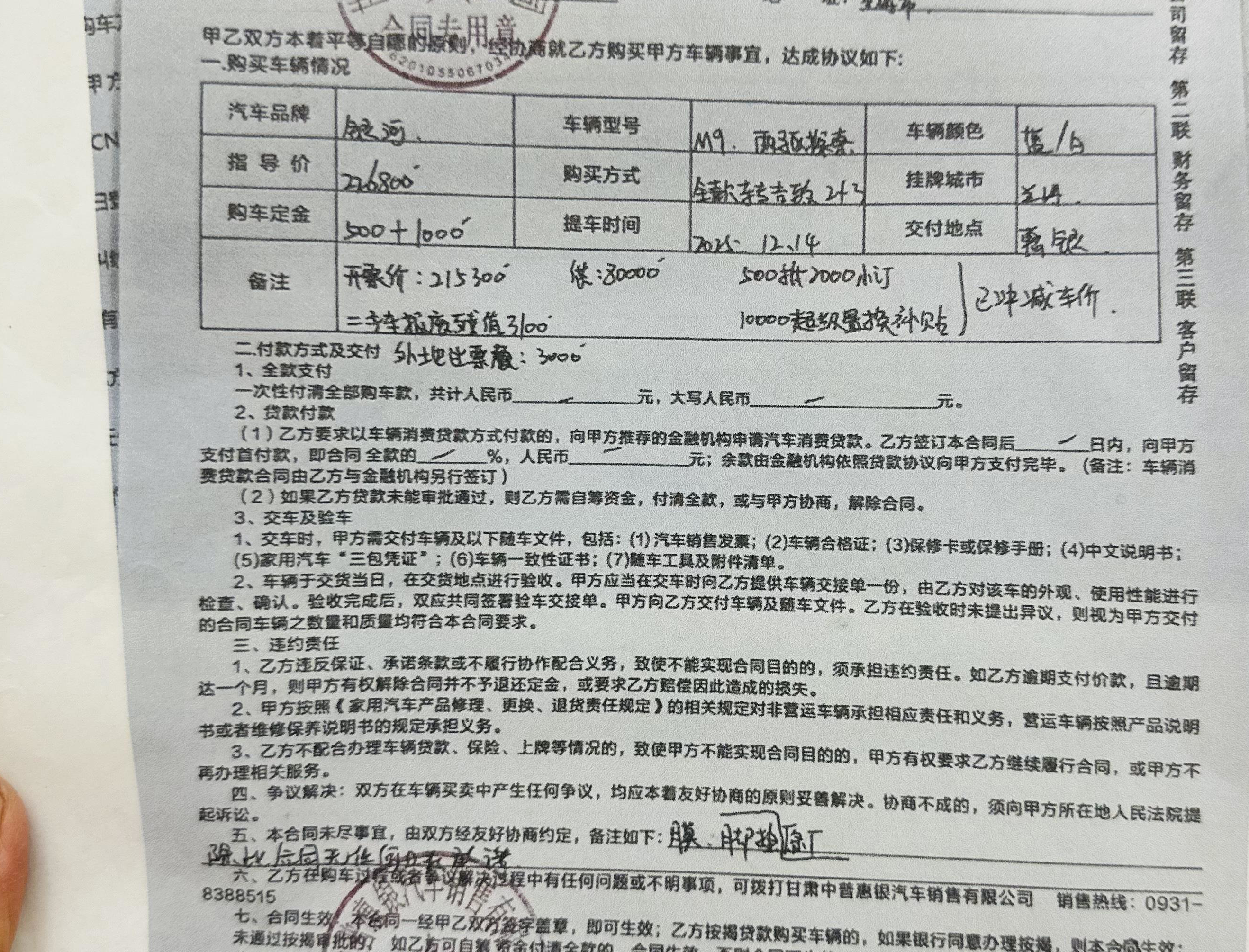 马女士告诉记者,去年10月,哥哥赵先生在位于城关区盐场路西北汽车城内的吉利银河4S店预订了一台吉利银河M9新能源汽车,价值215300元。销售员当时称该车暂时无货,需要等待。其间,赵先生再三向销售员确认是否能享受到以旧换新补贴,并明确表示,如果2025年的补贴政策暂停,他愿意等到新一轮补贴下来后再购买。2025年12月13日,该4S店销售员多次联系赵先生称,正好有一位在外地无法提车的顾客预订了同款车型,虽然甘肃省以旧换新补贴政策已经暂停,但可以通过公司内部渠道享受到外地政策补贴,并承诺会想办法为赵先生办理。12月14日下午,赵先生到店办理了手续,顺利提走新车。销售员表示需要贷款8万元分5年还清,否则无法享受车辆补贴。