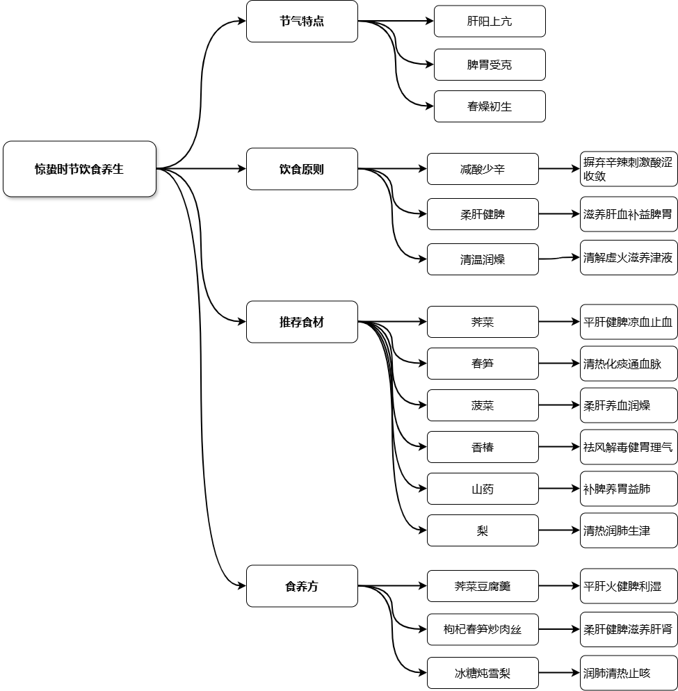 惊蛰时节,阳气升发过速,易致肝阳上亢、脾胃受克,故饮食当减酸少辛以抑肝木之过旺,增甘润以养脾土之和缓,同时宜选性平微凉、滋阴润燥之品,以缓春阳升势、润初生燥气。