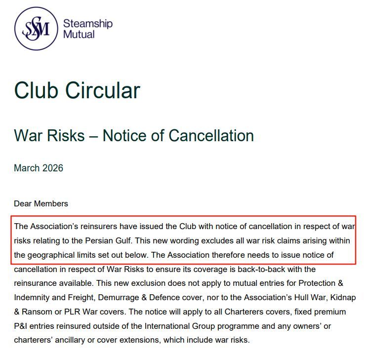 3月1日,Gard AS(嘉德保险)发布公告称,已收到再保人发出的伊朗及波斯/阿拉伯湾地区战争风险的保障取消通知,据此通知受影响的保险保障于3月5日相应取消。