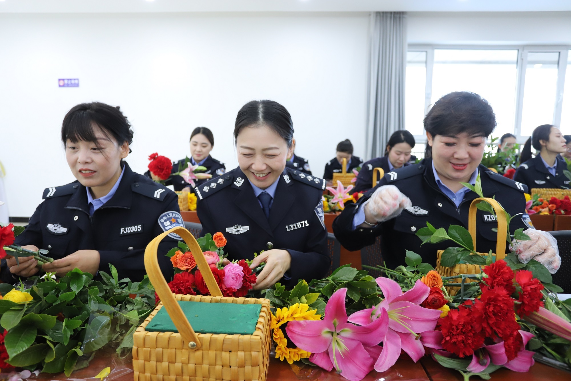 活动现场布置得温馨雅致,花艺老师从花材辨识、修剪技巧、色彩搭配到造型构图等方面进行了细致讲解,并现场示范指导。平日里英姿飒爽的女警们卸下工作疲惫,化身“花艺师”,在花香四溢中开启了一场与美的邂逅。她们精心挑选玫瑰、康乃馨、洋桔梗等花材,认真修剪枝叶,巧妙搭配色彩,将一朵朵鲜花错落有致地插制成独具匠心的艺术品。经过一番精心创作,一束束生机盎然、造型别致的插花作品新鲜“出炉”,女警们手持作品合影留念,定格下这美好瞬间。活动现场欢声笑语不断,气氛热烈而温馨。在插花环节结束后,女警们纷纷登台表演文艺节目,用歌声、舞蹈等形式庆祝属于自己的节日。她们或深情演唱经典歌曲,或翩翩起舞展现优雅身姿,或朗诵诗歌抒发真挚情感,充分展现了公安巾帼队伍昂扬向上、多才多艺的精神风貌。