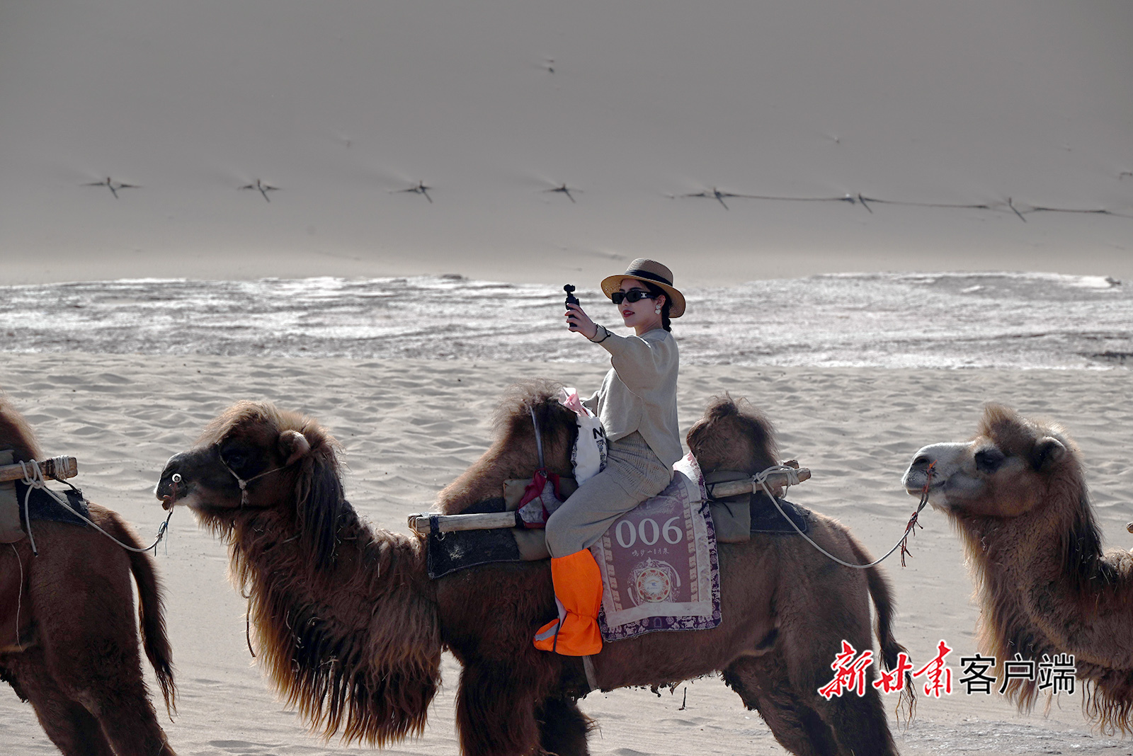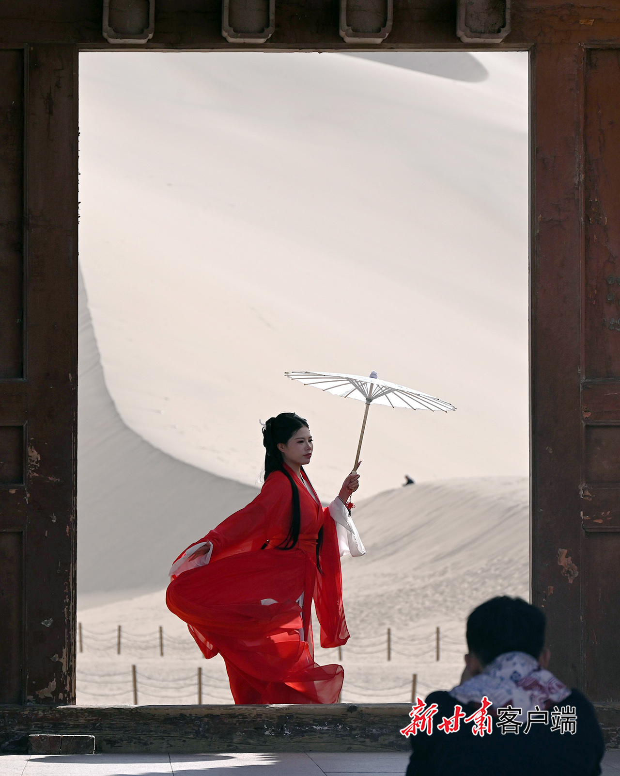 3月8日,女游客走进敦煌市鸣沙山月牙泉景区拍照、体验,欢度“三八”国际妇女节。