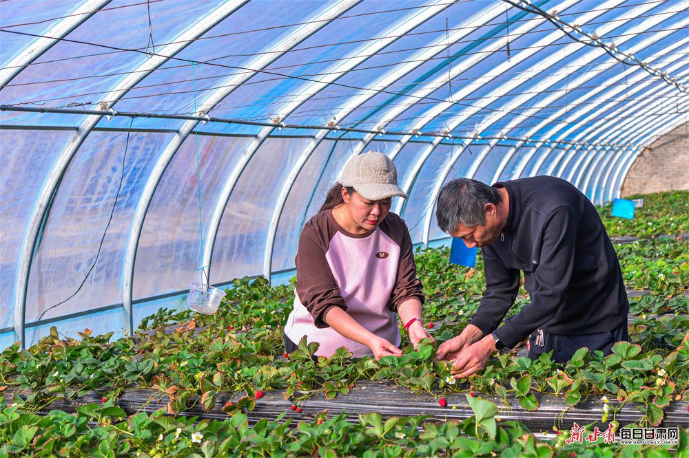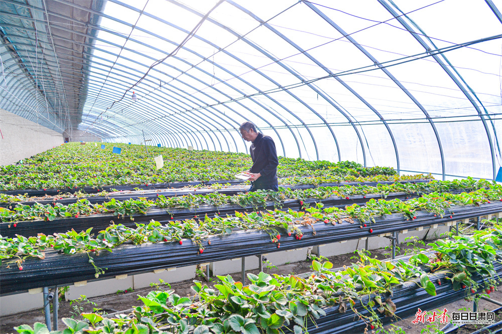 早春时节,敦煌市转渠口镇创业农业园区温室大棚内绿意盎然,市农技中心技术人员正巡查智能助农设施运行状况,以科技为春耕生产添动力。