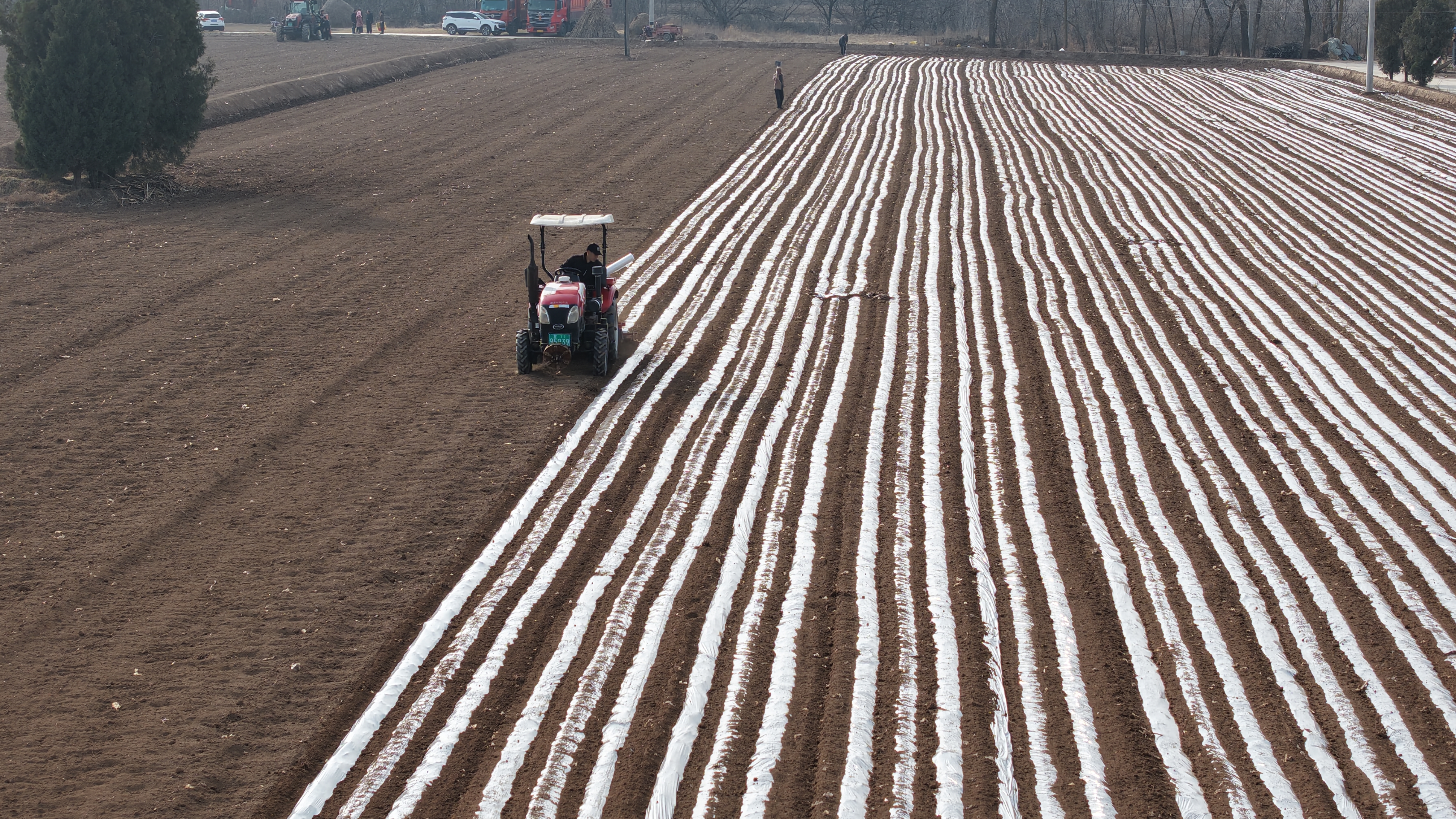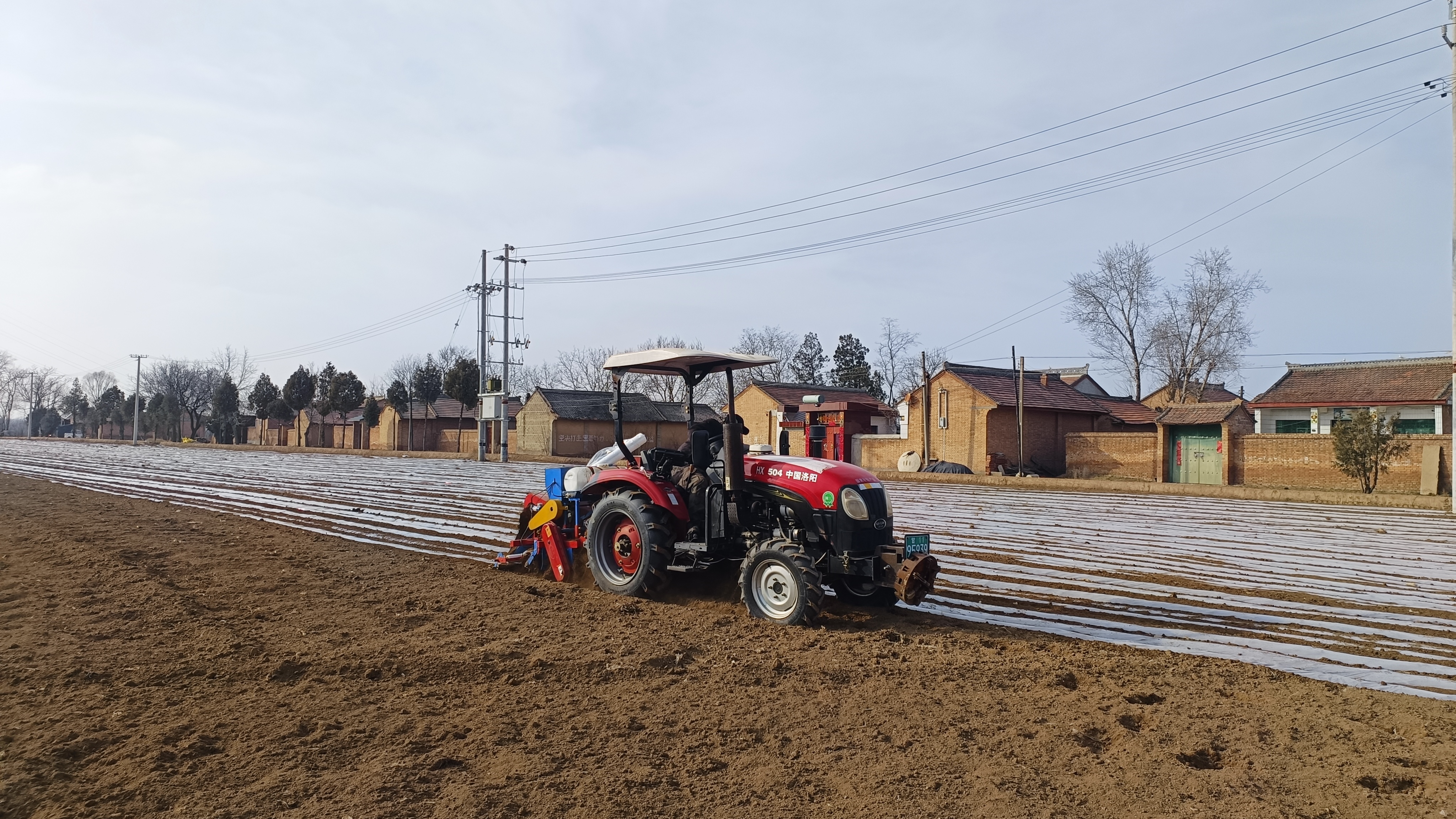 与此同时,在西屯镇郭阳村的玉米种植示范田里,一派热火朝天的劳动景象映入眼帘。伴随着机器的轰鸣,覆膜机在平整好的田地里来回作业,银色的地膜如丝带般铺展开来,在阳光下熠熠生辉。村民们紧随其后,熟练地挥锹铲土,压实地膜边缘,以防大风揭膜。
