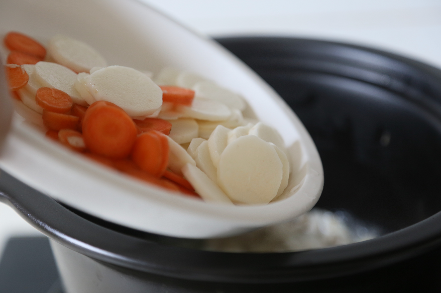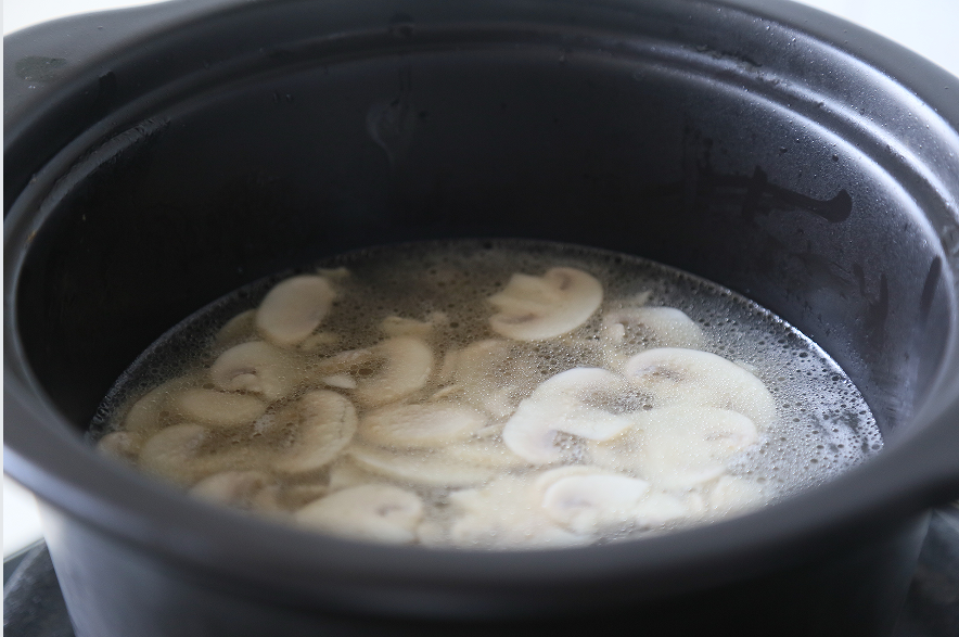 2.汤锅加热后放薄油,放入蘑菇片炒软;再倒入山药圆片和胡萝卜圆片,加入热水烧开。
