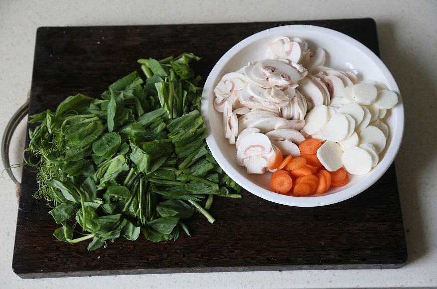 1.山药去皮切薄圆片,胡萝卜切薄圆片,蘑菇切薄片,豌豆尖切段。