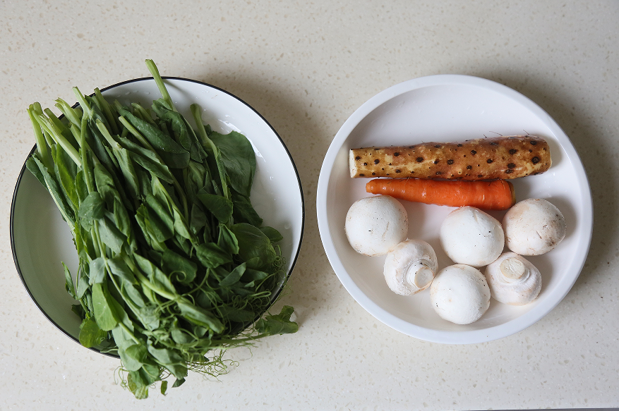 用料:豌豆尖150克,山药100克,胡萝卜1根,蘑菇100克,盐少许。
