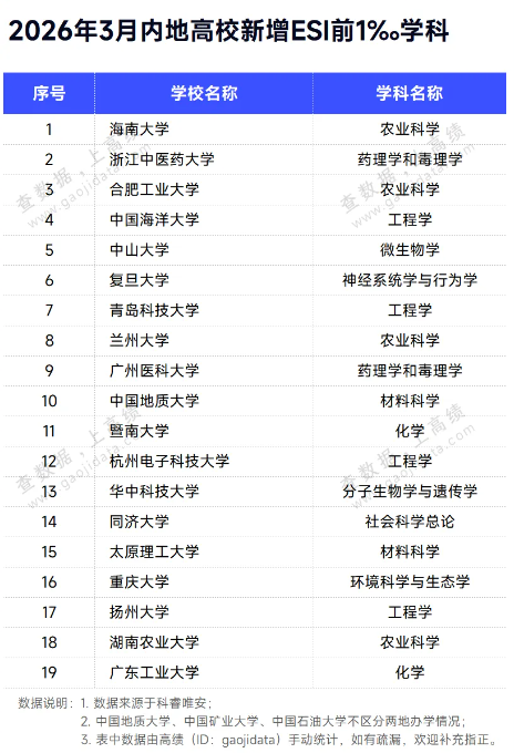其中,化学、环境与生态学、农业科学3个学科进入ESI全球排名前1‰,进一步彰显了学校的科研实力与国际影响力。
