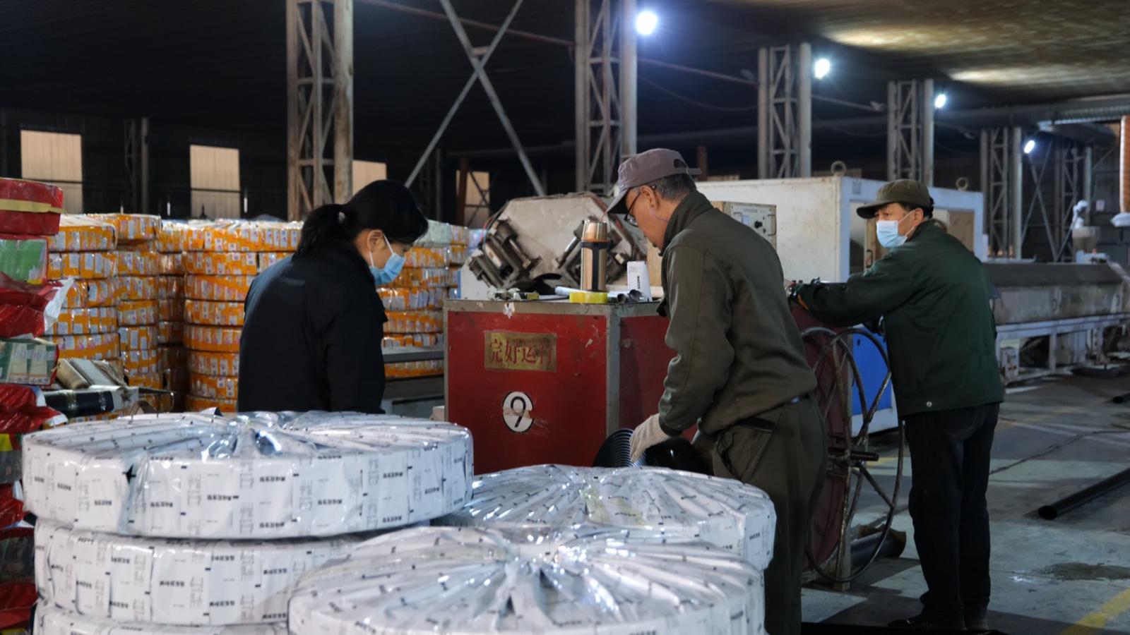 在永昌县庆源丰高效节水农业开发有限责任公司,忙碌氛围同样浓厚。一卷卷地膜、一盘盘滴灌带整齐堆放待发,操作工人坚守岗位、争分夺秒,全力加快生产进度。