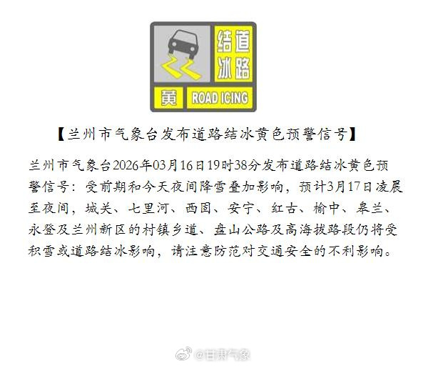 兰州市气象台2026年03月16日19时38分发布道路结冰黄色预警信号: