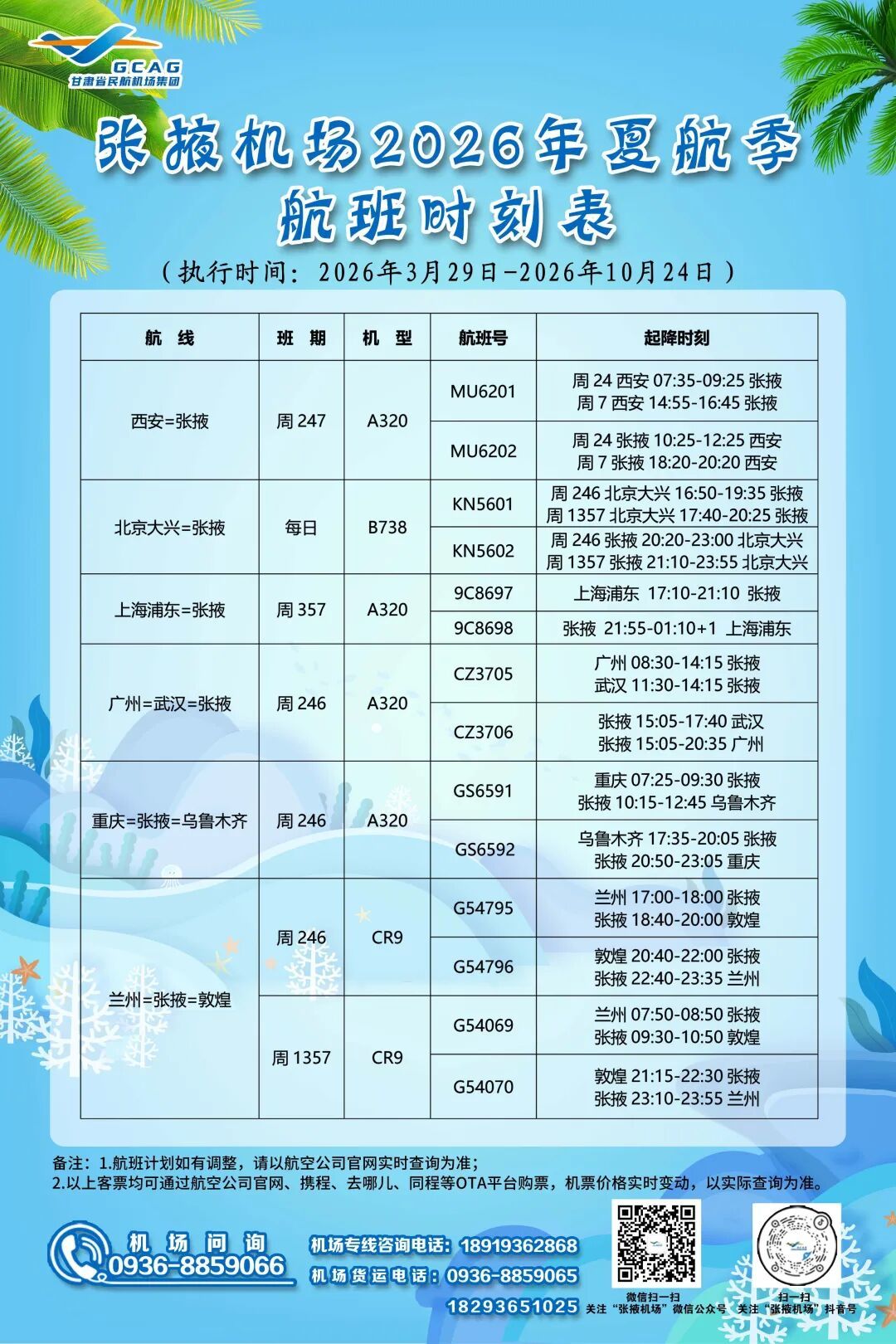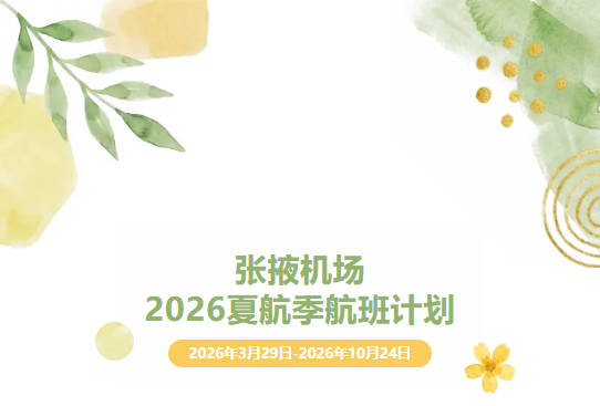 开启新程,畅飞无忧!张掖机场2026年夏航季航班计划正式发布,执行时间2026年3月29日至2026年10月24日,多条航线覆盖国内核心城市与热门旅游地,出行、出游、商贸往来更便捷,乘航班邂逅彩虹张掖的美好吧~