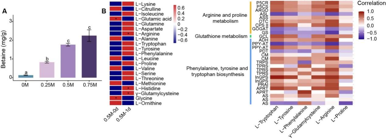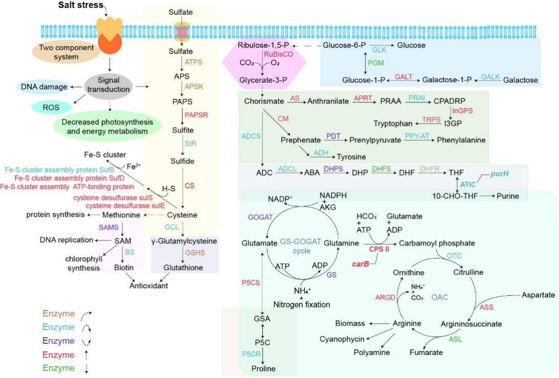 盐胁迫初期,光合作用和能量代谢被抑制,活性氧(ROS)积累。此时,硫代谢通路被激活:一方面提供谷胱甘肽用于ROS清除和DNA修复,另一方面支持铁硫簇合成。铁硫簇与磷酸戊糖途径产生的NADPH、细胞色素b6-f复合物协同作用,增强光系统Ⅰ的循环电子流,为光系统Ⅱ的修复创造条件。简单来说:硫代谢负责“清障”,电子传递链负责“供能”,两者配合,让受损的光合系统得以恢复。研究还发现γ-谷氨酰半胱氨酸、组氨酸、精氨酸等13种氨基酸在盐胁迫下显著积累,形成了一个庞大的“抗逆代谢库”。
