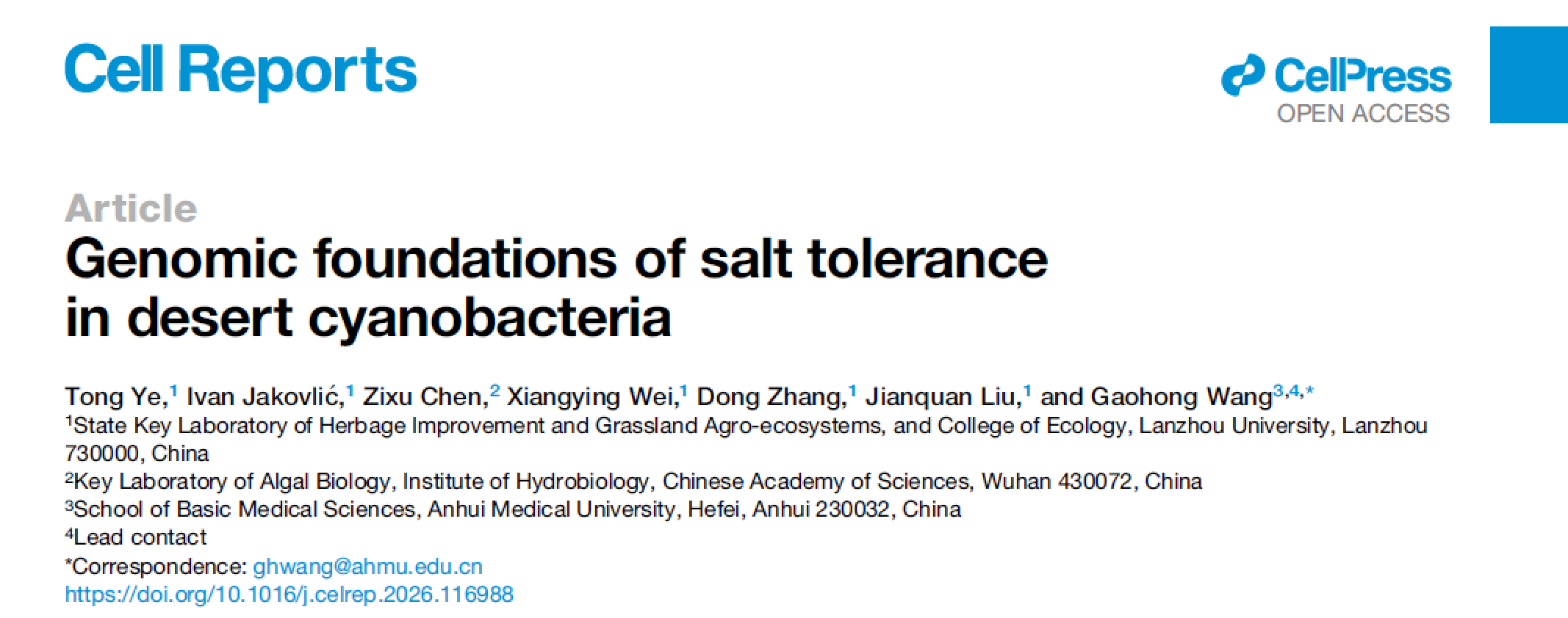 近日,兰州大学与安徽医科大学联合科研团队在《Cell Reports》发表了题为“Genomic foundations of salt tolerance in desert cyanobacteria”的研究,首次从基因组层面揭开了荒漠蓝藻的耐盐之谜。