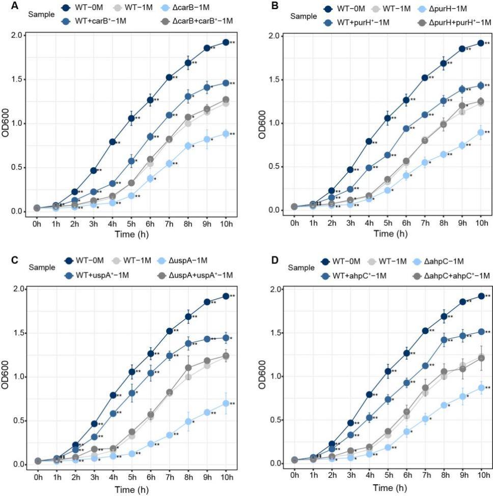 除了独门绝技,FACHB-892还与其他生境的耐盐蓝藻共享一套“通用工具箱”。研究团队从40株蓝藻中筛选出17株耐盐“选手”,通过进化分析锁定16个受到强烈正向选择的基因。这些基因涉及DNA合成、抗氧化、光合作用、氨基酸代谢等多个功能类别。其中4个基因在转录组分析中被证实受盐胁迫诱导表达,成为重点研究对象(ahpC、uspA、purH、carB)。这4个基因的耐盐功能通过跨物种实验得到验证:在大肠杆菌中分别敲除这四个基因的同源物,菌株在1 M盐胁迫下生长严重受阻(uspA敲除株受影响最显著);回补这些基因后,生长能力恢复;过表达株则表现出比野生型更强的耐盐能力。这一结果说明:这四个基因的功能在不同物种间是保守的,均能在盐胁迫下发挥保护作用。值得注意的是,purH和carB此前从未被证实与耐盐性直接相关。这项研究首次揭示了它们在原核生物耐盐中的关键作用,为后续基因工程改造提供了全新靶点。