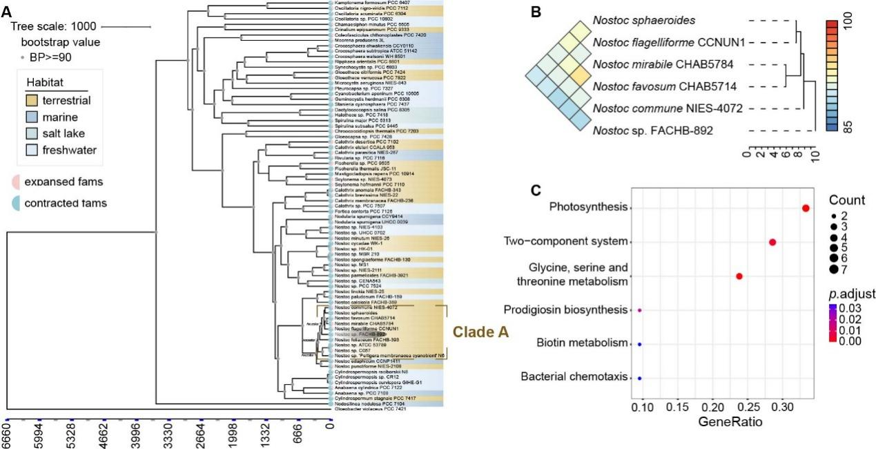 研究团队从腾格里沙漠采集到一株优势蓝藻(Nostoc sp. FACHB-892)。通过PacBio三代测序技术,他们获得了高质量的完整基因组。这株蓝藻与其近缘物种相比,基因组相似度只有90%左右。这意味着,它很可能是一个尚未被记录的新物种,在漫长的进化过程中发展出了独特的生存策略。