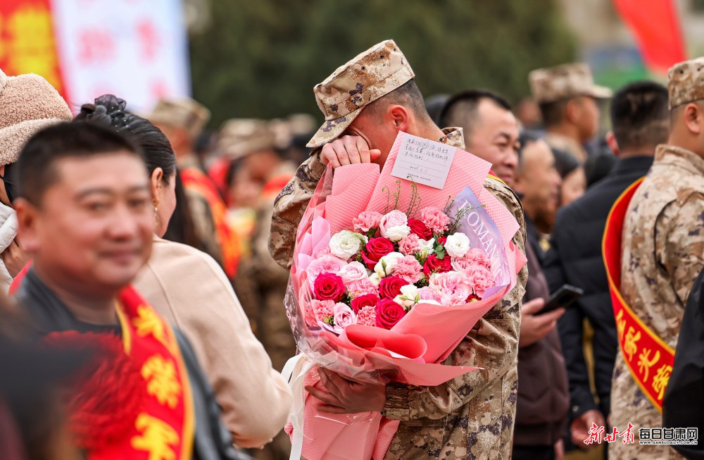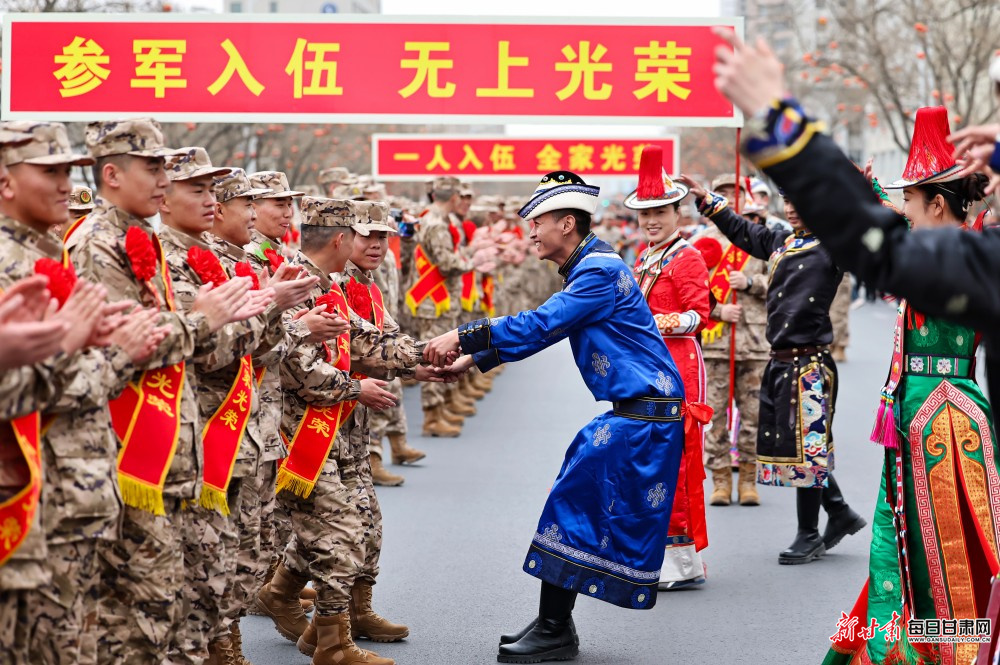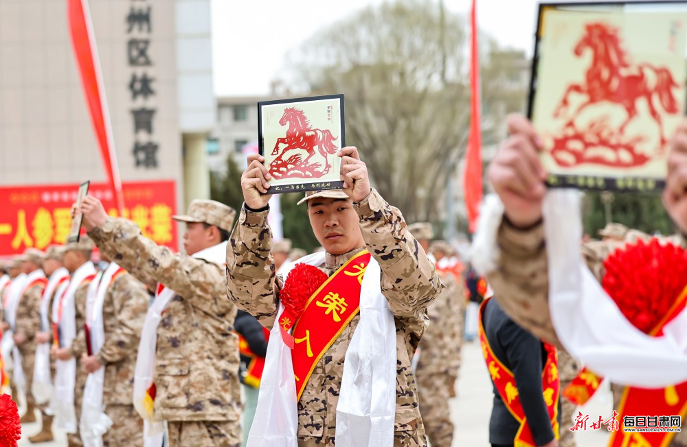 仪式现场温情满满、特色浓郁。除了庄严的新兵宣誓环节,仪式还精心安排了亲情喂饺、游街等传统活动,寓意着团圆与祝福。群众自发涌上街头,为即将远行的新兵敬献洁白的哈达,送上蕴含吉祥寓意的非遗剪纸、香囊及绣花鞋垫。这些特色礼品满载着家乡人民的深情厚谊,传递着“一人参军、全家光荣”的尊崇氛围。
