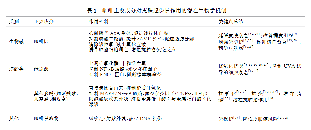 除了咖啡因,还有绿原酸,这是一种多酚类物质,主要通过抗氧化和抗炎作用保护皮肤。