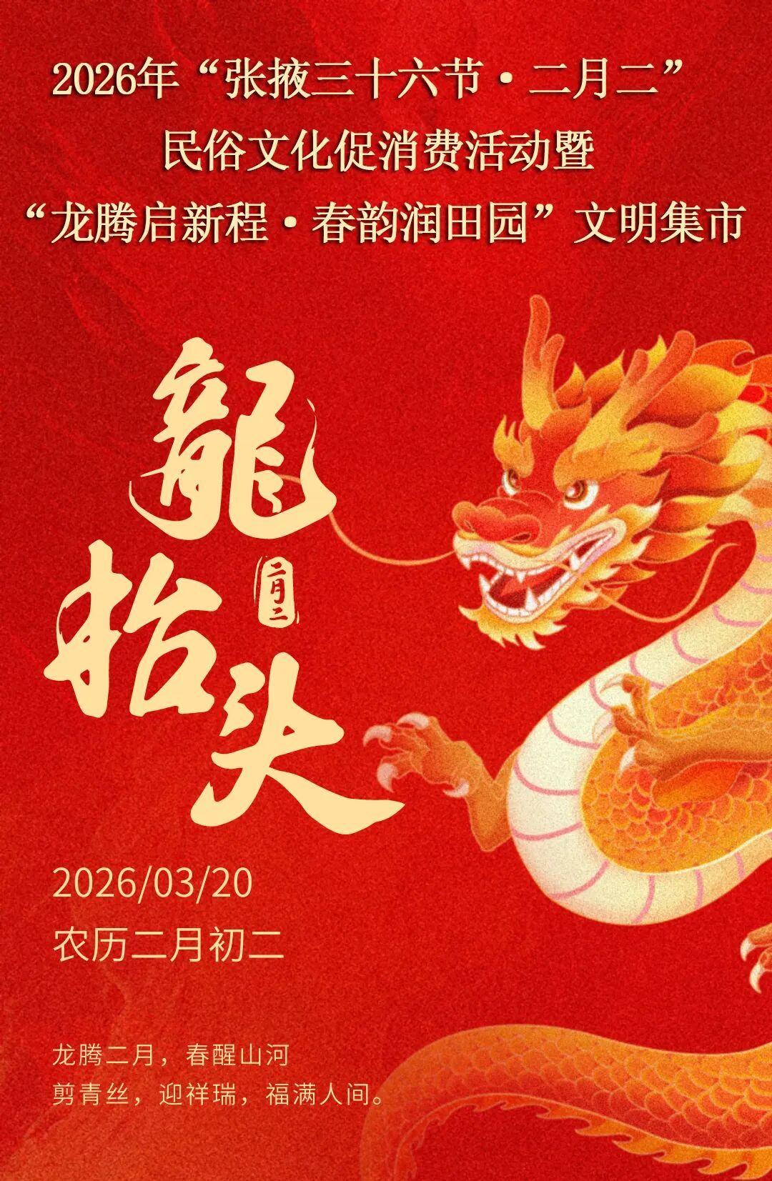 为深入学习贯彻习近平文化思想,传承弘扬中华优秀传统文化,推动传统节日振兴工程落地见效,按照《“张掖三十六节”系列文旅活动申报管理办法》要求,深入挖掘“二月二”民俗文化、龙文化、农耕文化内涵,突出非遗展示、民俗体验、群众参与、文旅惠民,着力提升活动文化品位和品牌影响力,特举办2026年“张掖三十六节·二月二”民俗文化促消费活动暨“龙腾启新程·春韵润田园”文明集市。