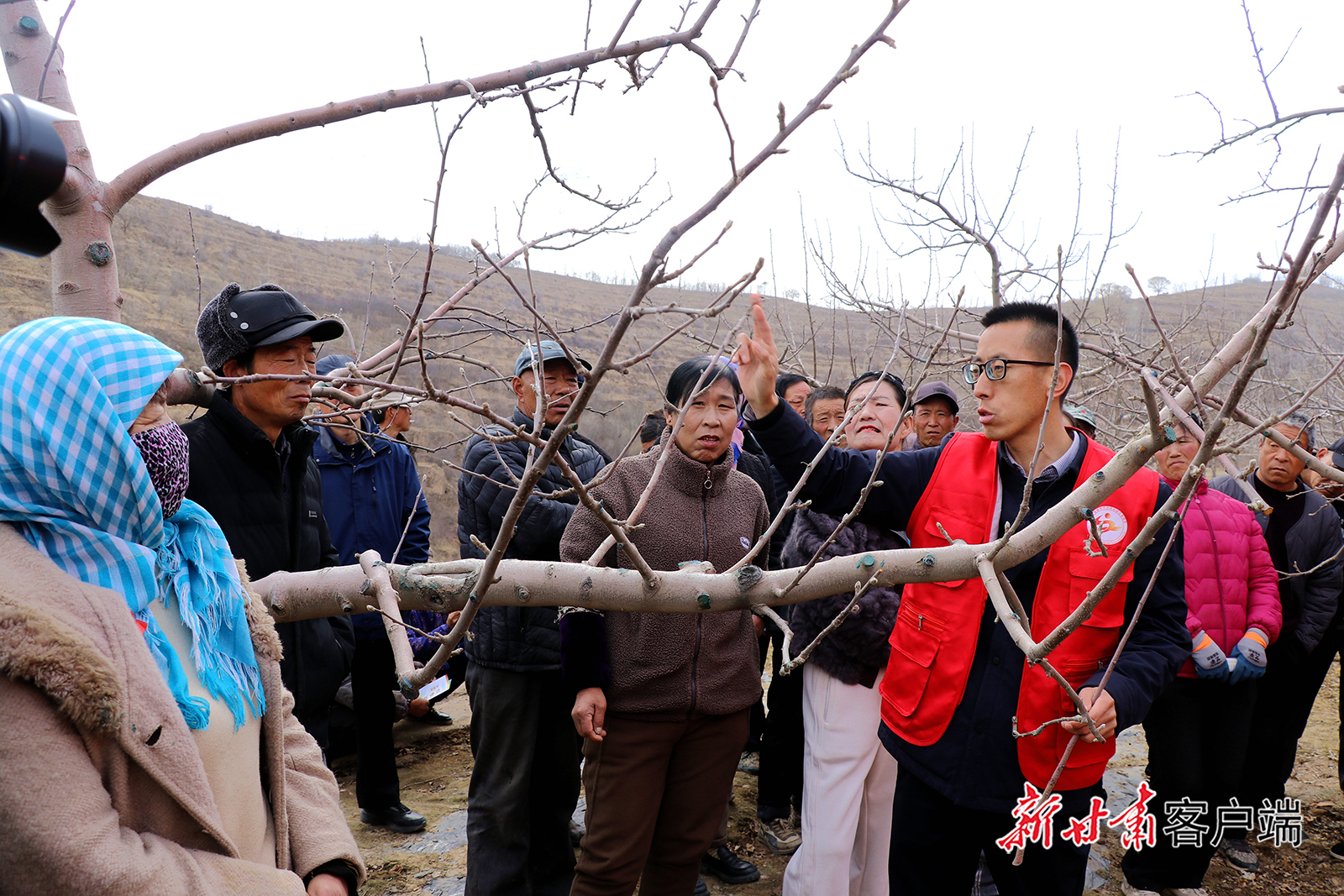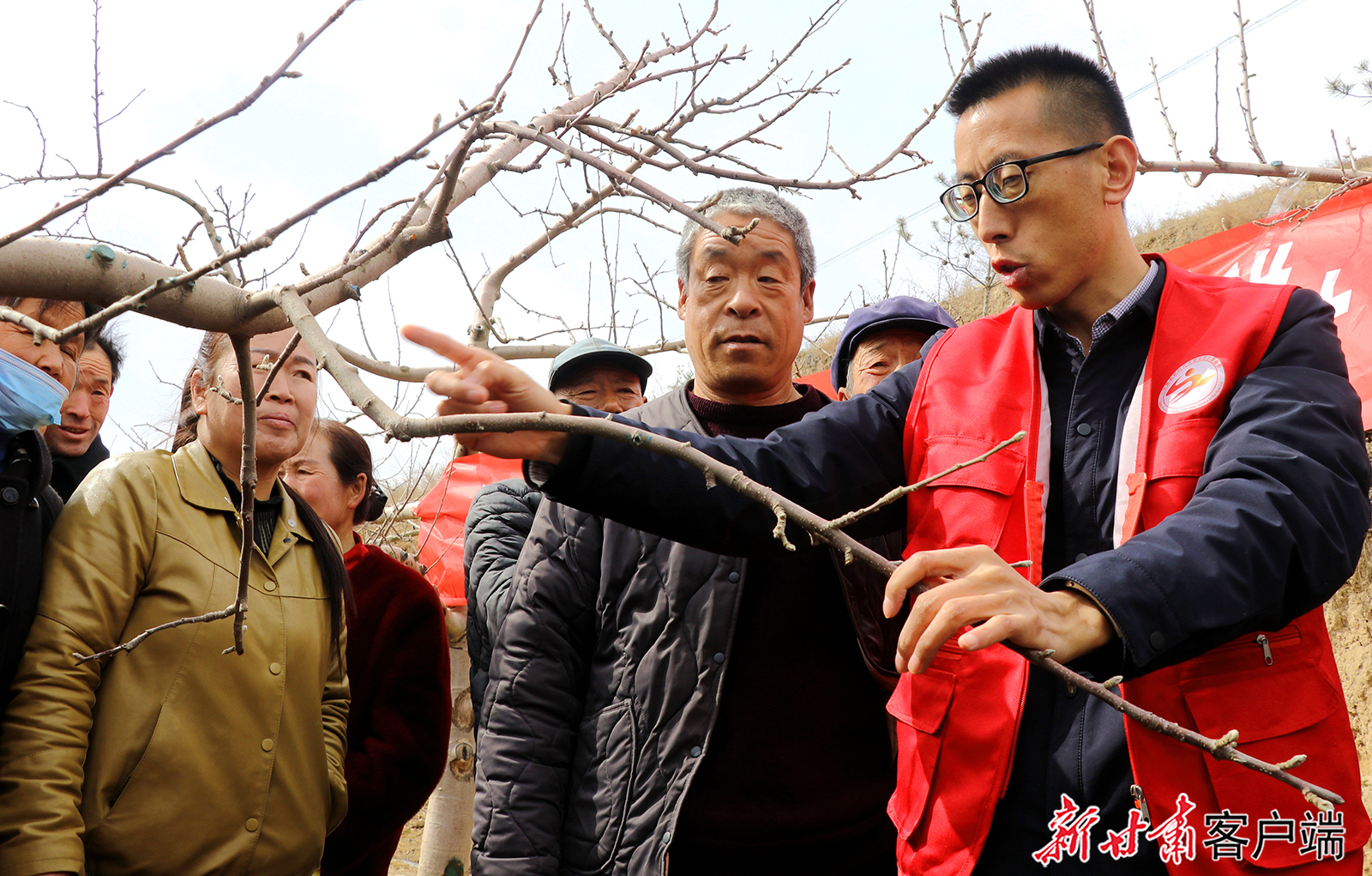 3月18日,在静宁县威戎镇杨湾村果园里,林果业技术宣讲员正为村民讲解春季果园管理技术。