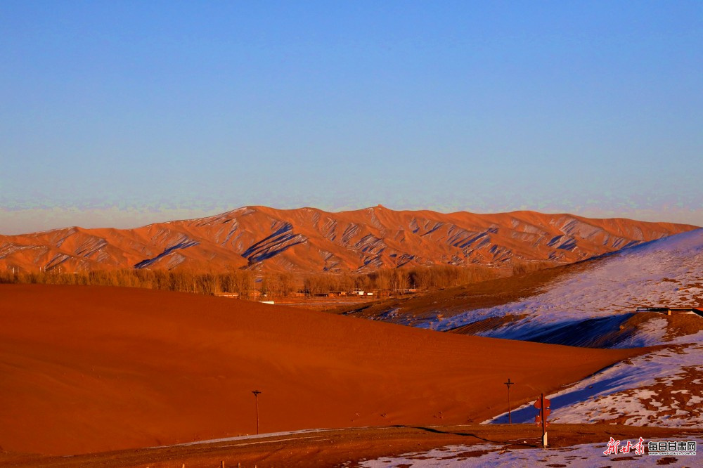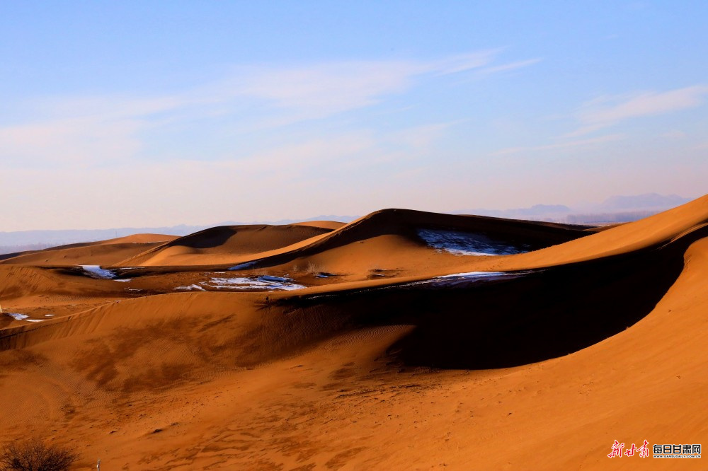春日的河西走廊,巴丹吉林沙漠西缘,张掖市临泽县板桥镇壕洼村的金沙湾景区迎来最佳观赏期。澄澈蓝天之下,连绵沙丘如鎏金脉络,明暗交织的曲线间点缀着零星残雪,雄浑大漠更添几分清冷诗意。