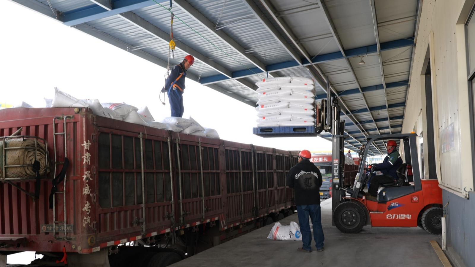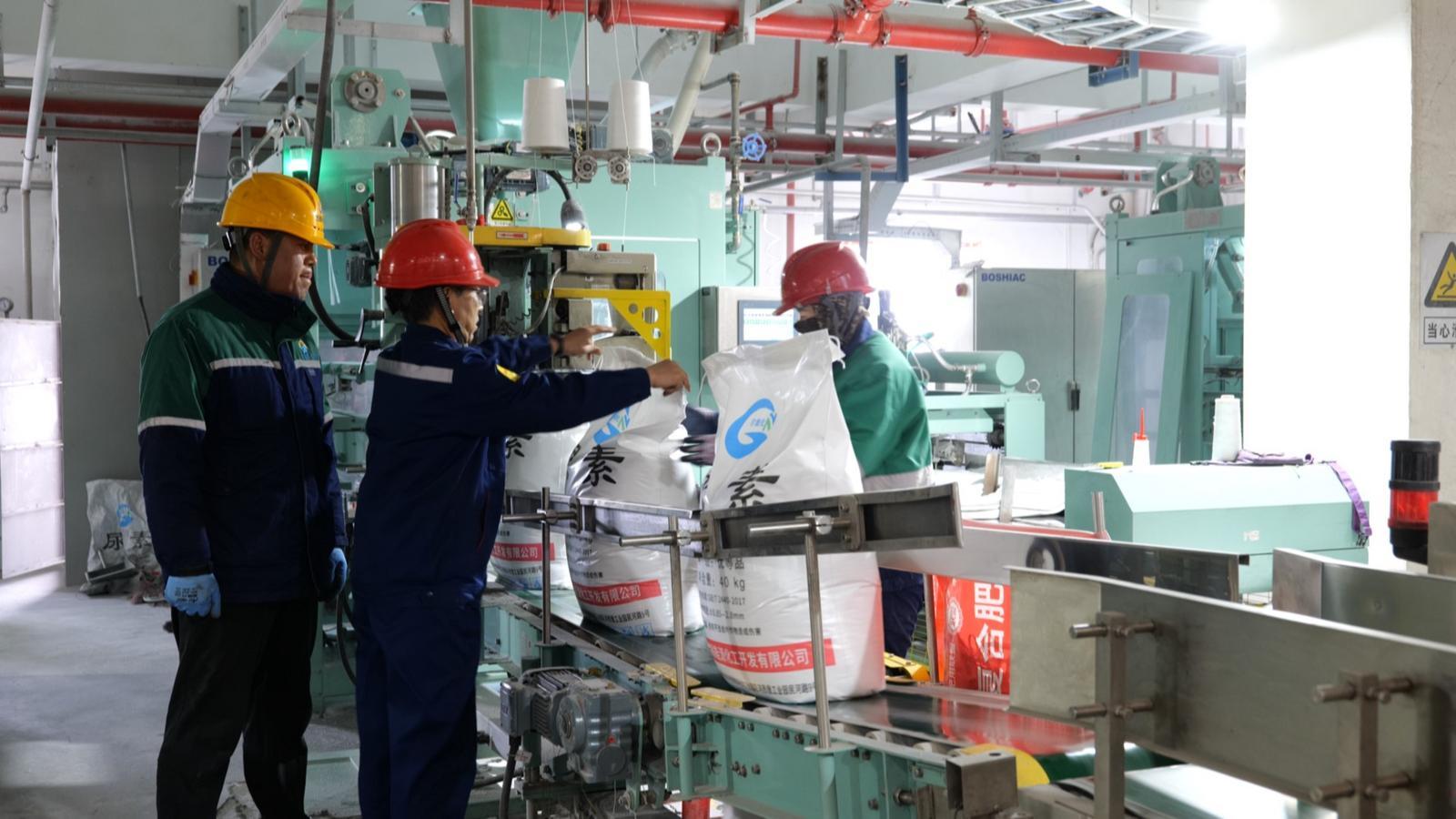 在甘肃能化金昌能源化工开发有限公司的包装车间内,两条全自动包装线高速运转,一袋袋尿素经过封装、输送,源源不断运往成品库。成品库内,叉车往来穿梭,将成摞的尿素精准装载到库房门口等候装货的大货车上,这批尿素将发往园区内外多家化肥企业,成为制作复合肥的重要原料。