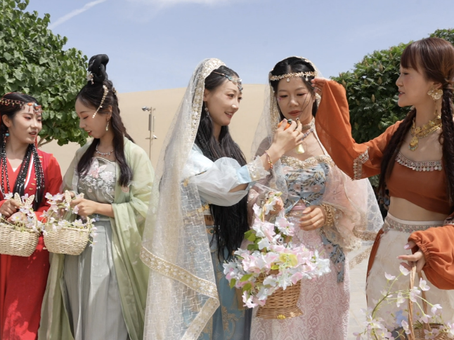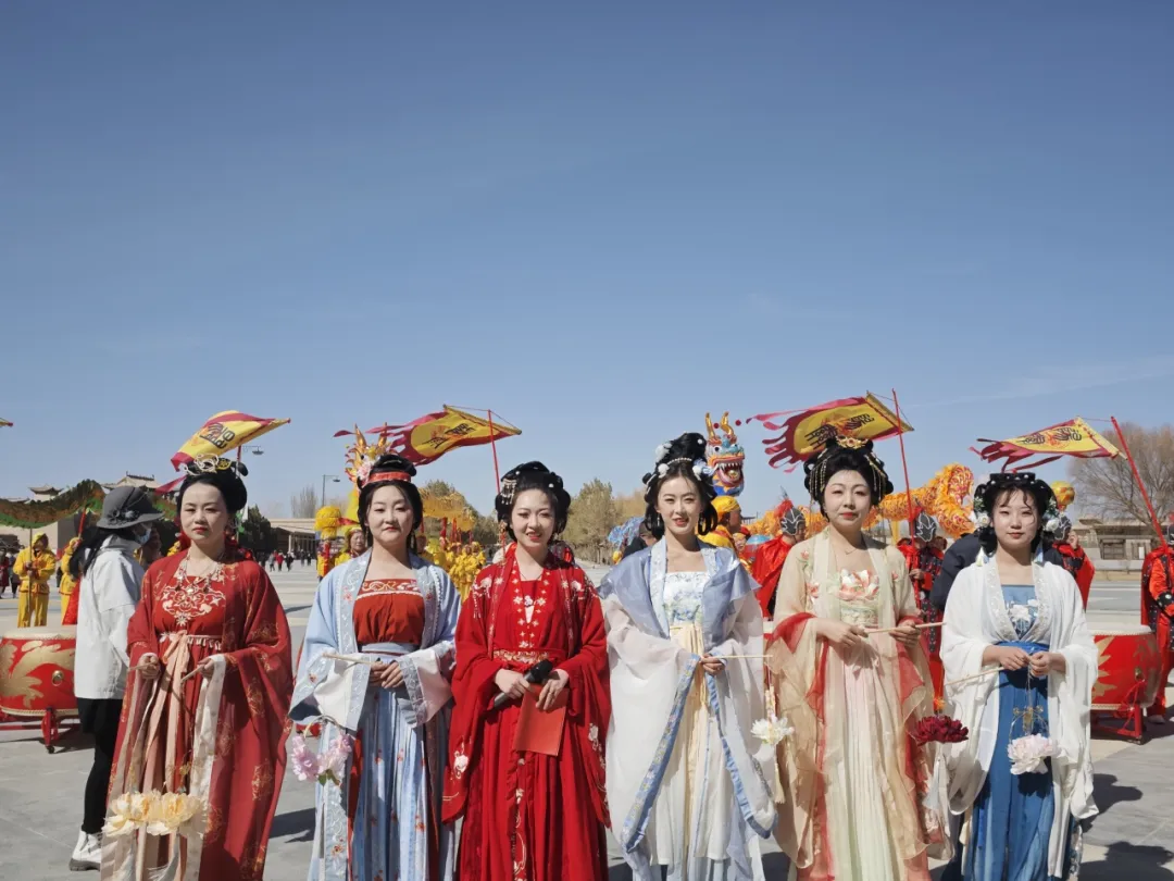 春分时节,昼夜平分,正是踏青好时节。由身着华丽汉服、飞天服饰的佳人组成的巡游队伍,手持纸伞、团扇,沿着月牙泉畔款款而行 。衣袂翻飞间,与古朴的塔楼相映成趣。您不仅可以驻足围观拍照,更可以加入到巡游队伍中。