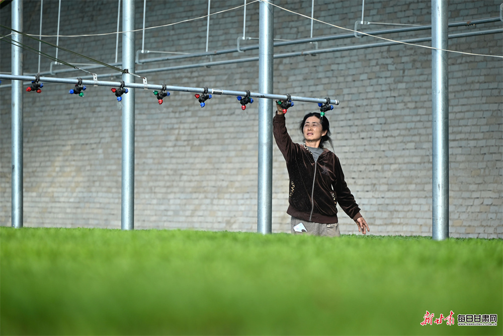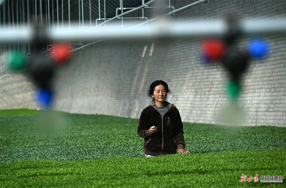3月20日,在敦煌市莫高镇苏家堡村的设施大棚内,农户们忙着管护瓜菜幼苗,一株株嫩苗长势喜人。棚内,自动喷灌设备精准作业,均匀喷淋水肥,高效助力幼苗健壮生长,一派人勤春早的忙碌景象。