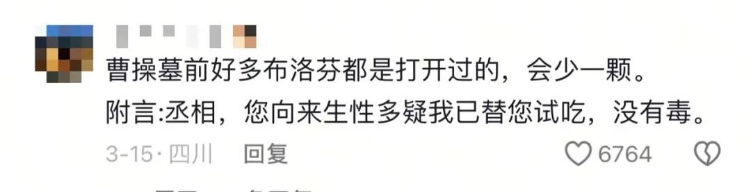 曹操墓前,一排排布洛芬,整齐摆放,大多还没过期,更贴心的是,有人特意附上了简易医嘱。