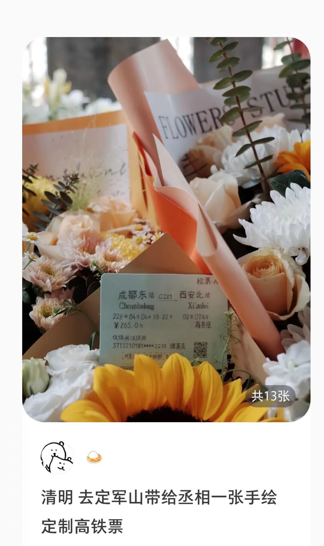 刘备墓前的供品,放着从西安到成都的高铁票。