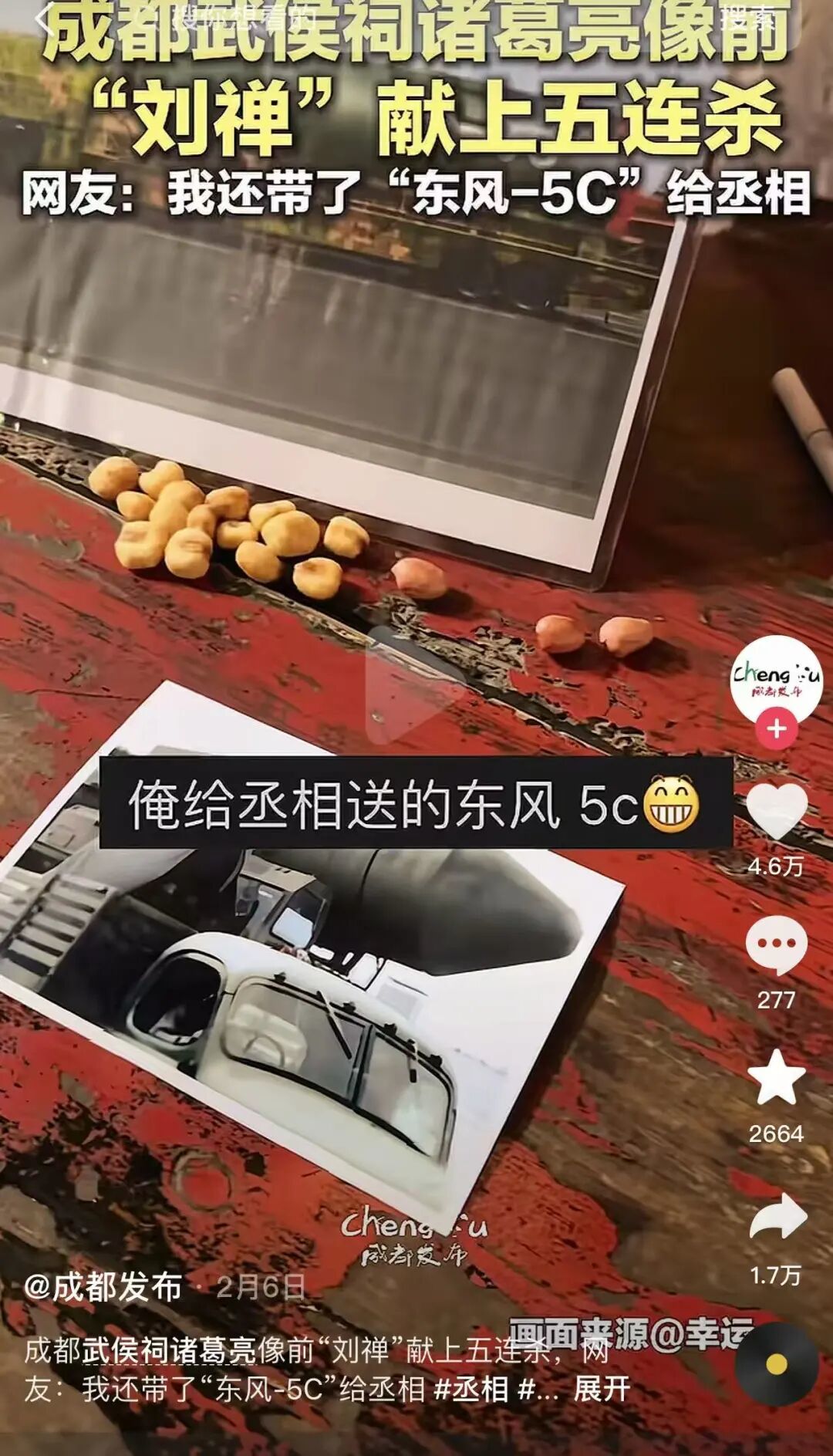 成都武侯祠里,诸葛亮的塑像前,供品堪称“要素拉满”。一枚小小的东风导弹模型,旁边还放着一张纸条,写着“丞相,这次不用借东风,我们自己有东风了”。