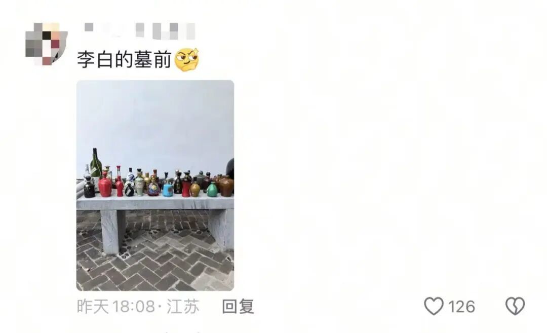 “天子呼来不上船,自称臣是酒中仙”,李白的一生,与酒为伴,与诗为友。他的墓前,最不缺的就是酒——白酒、啤酒、果酒,甚至还有奶茶,摆满了墓碑前。