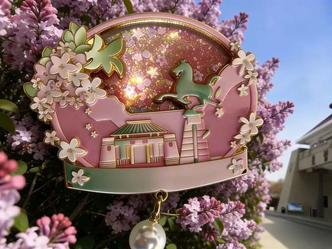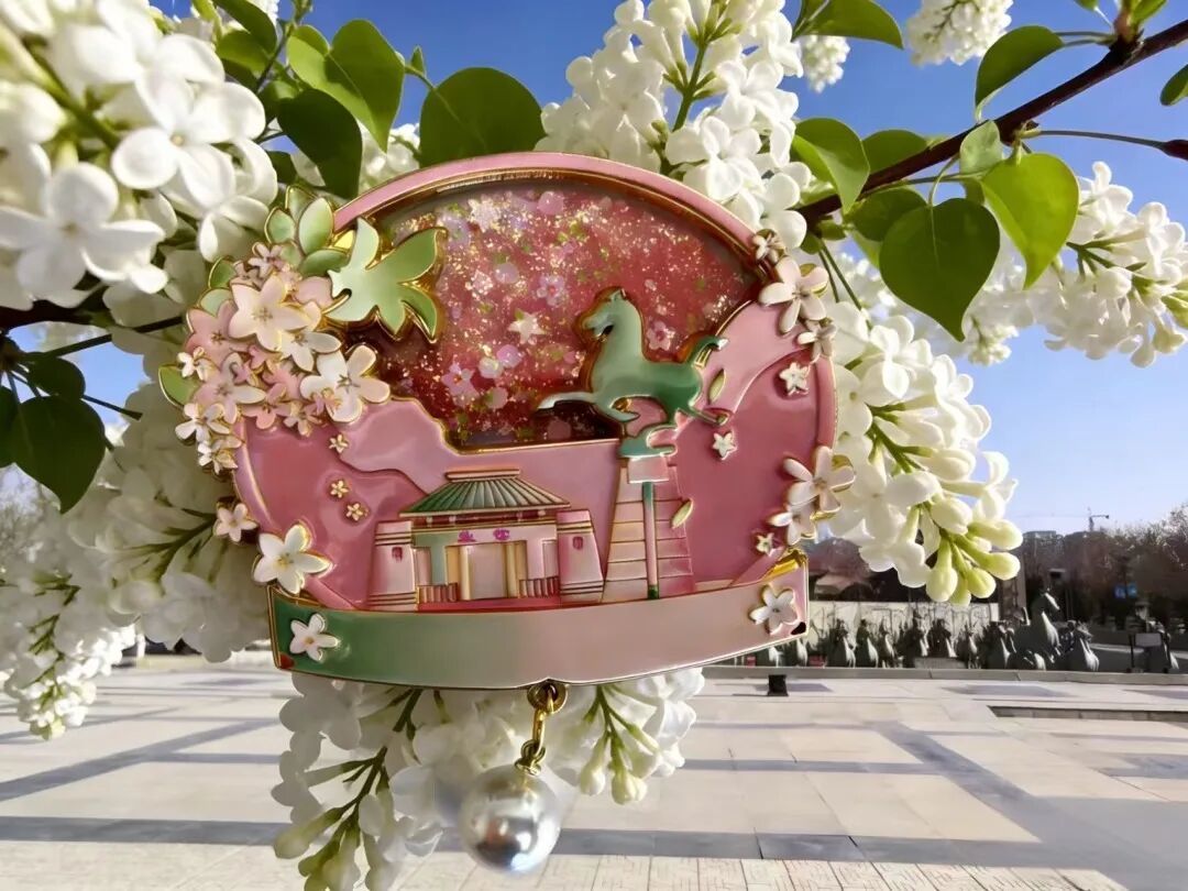 粉白繁花缀满边框,青骊铜奔马昂首扬蹄,鎏金流沙在霞光底色中缓缓流淌,珍珠垂坠轻摇,似是丝路驼铃的余响。它褪去青铜的沉郁,以柔粉与嫩绿晕染出汉家春色,让千年文物化作生活里的诗意小景。