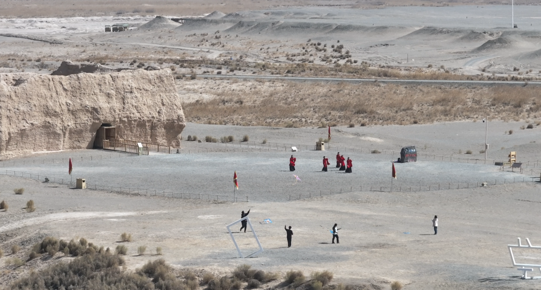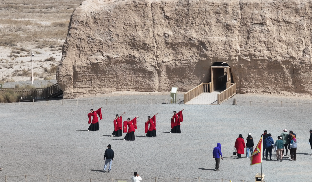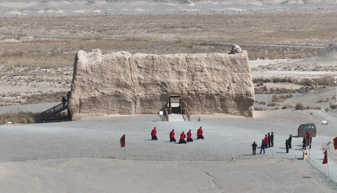 午后的阳光洒在小方盘城的夯土城墙上,斑驳的城墙在暖阳下泛着金黄的光泽。城前,工作人员身着鲜艳的汉服,随着欢快的音乐翩翩起舞。舞步轻快而富有节奏,仿佛在唤醒沉睡一冬的大地。古老的关城与优美的舞姿交相辉映,构成了一幅动人的画面。