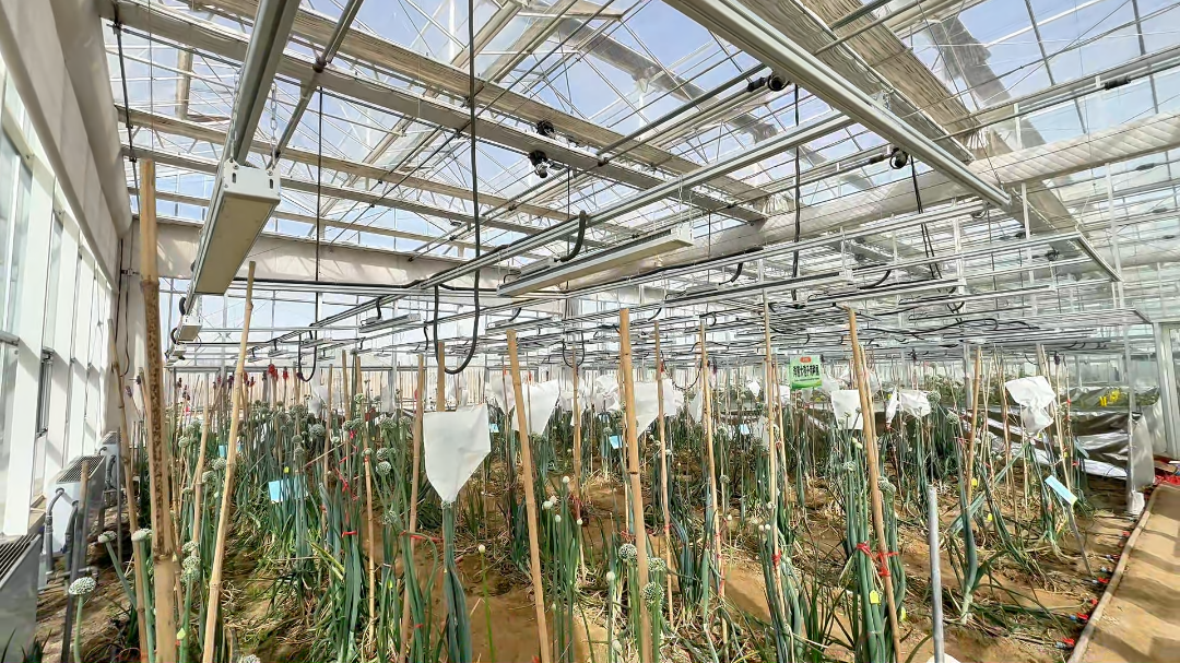 而在室外人工气候室,又是另一番景象。洋葱植株扎根于广阔土壤,在这里自由舒展枝叶、沐浴阳光、茁壮成长,直至抽出花序,最终结出饱满的种子。