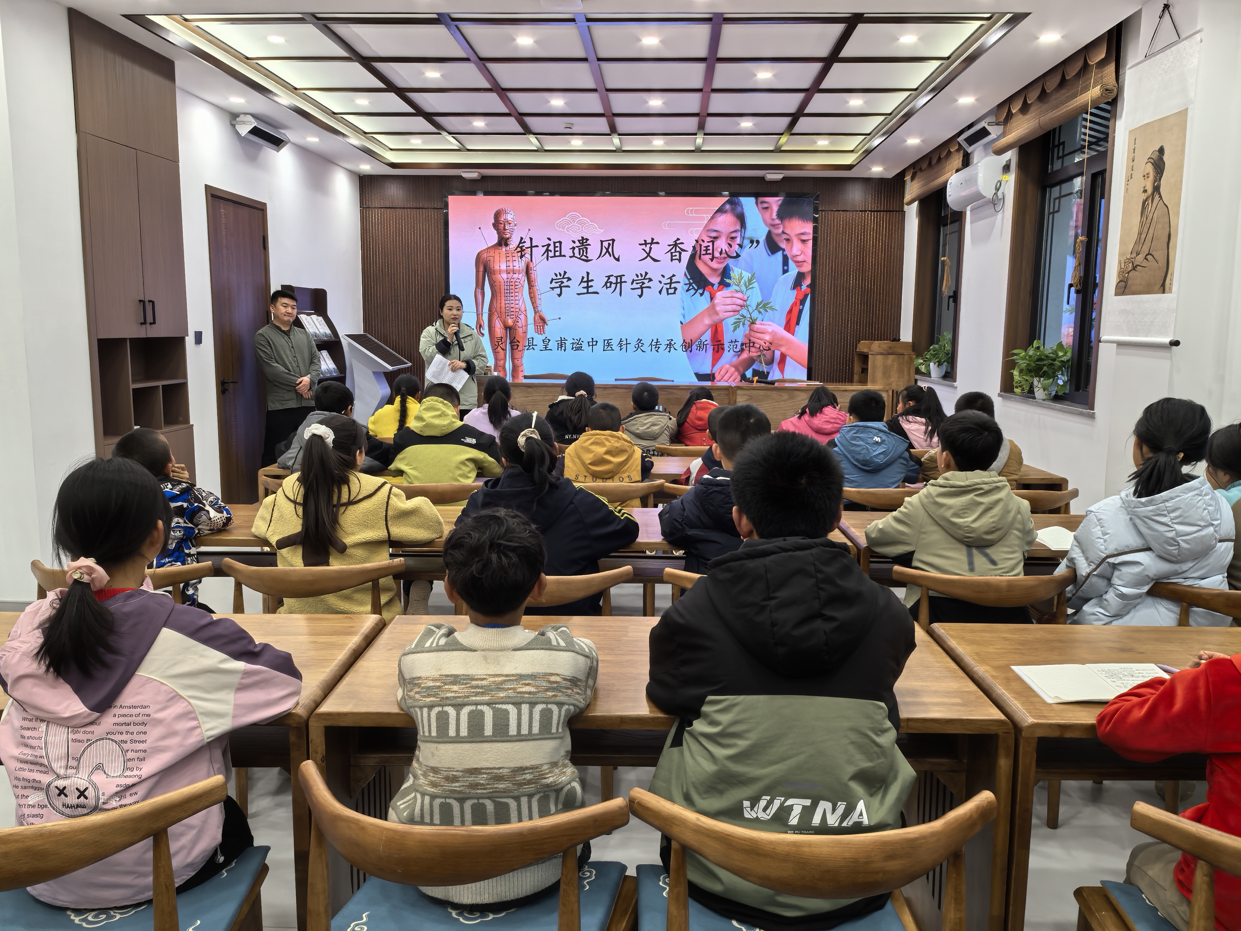随后,同学们来到皇甫谧中医针灸传承创新示范中心,有序参观场馆布局与展品陈设,直观感受中医针灸文化的传承脉络与创新发展。场馆工作人员结合青少年的认知特点,用通俗易懂、生动有趣的语言,为孩子们讲解中医针灸基础知识,把抽象的传统文化转化为鲜活可感的知识内容,让大家听得懂、记得牢,进一步加深了对中医文化的认知、理解与文化认同,让传统文化在青少年心中生根发芽。