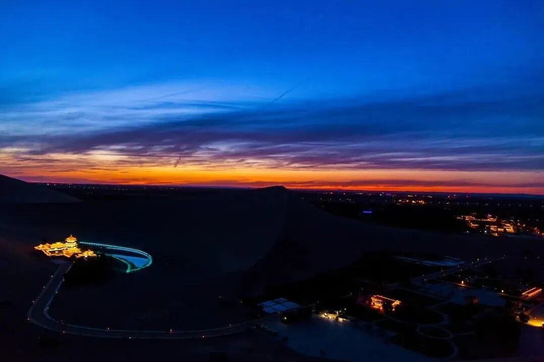 空中俯瞰:搭乘直升机或滑翔机,俯瞰沙山与清泉共生的自然奇迹与鸣沙山下杏花开放,震撼难忘。