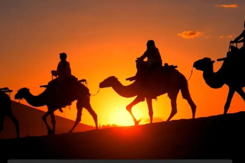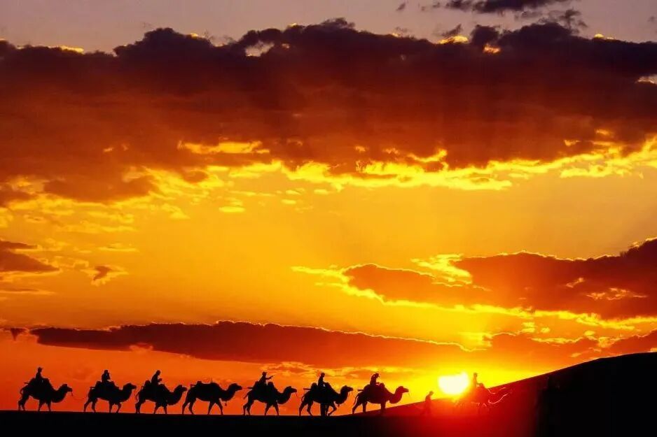 驼队剪影:日落时分拍摄,朋友圈爆款