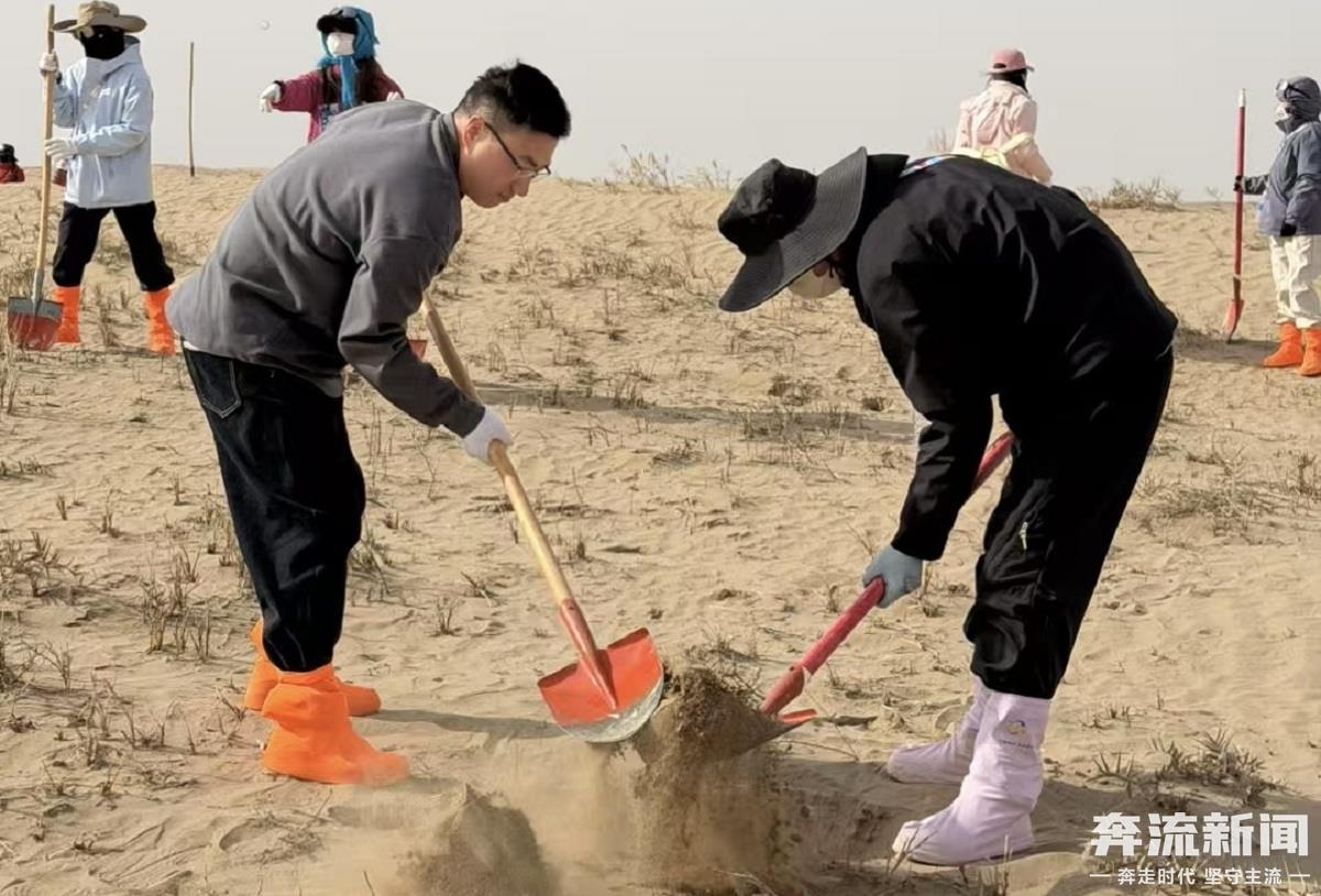 和无数奔赴而来的志愿者一样,他想在沙漠里种下一片绿色,也种下一点希望。不一样的是,他白天在沙地挥锹挖坑、浇水回填,晚上还要打开直播,帮当地农户卖人参果。