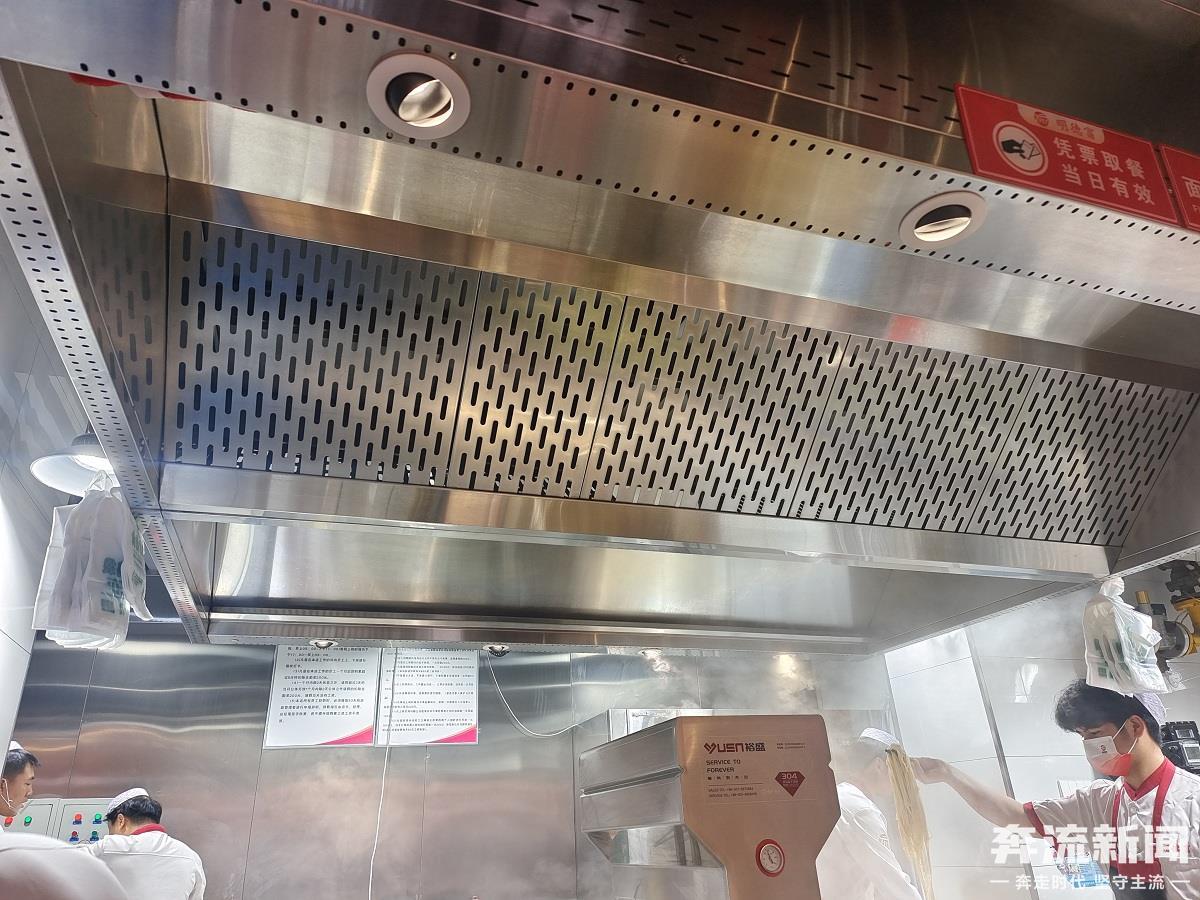 随后,记者和程经理一同来到涉事的牛肉面馆。一位工作人员表示,面馆已经按照物业要求进行了整改。除了24小时开抽风机,还保持卷帘门帘通风,以减少蒸汽在室内积聚。在面馆操作台前,记者也看到下面的大锅上方设有大型抽风机,将面锅中腾起的蒸汽抽走,面馆大门上的一扇门帘被卷起,保持面馆内通风。