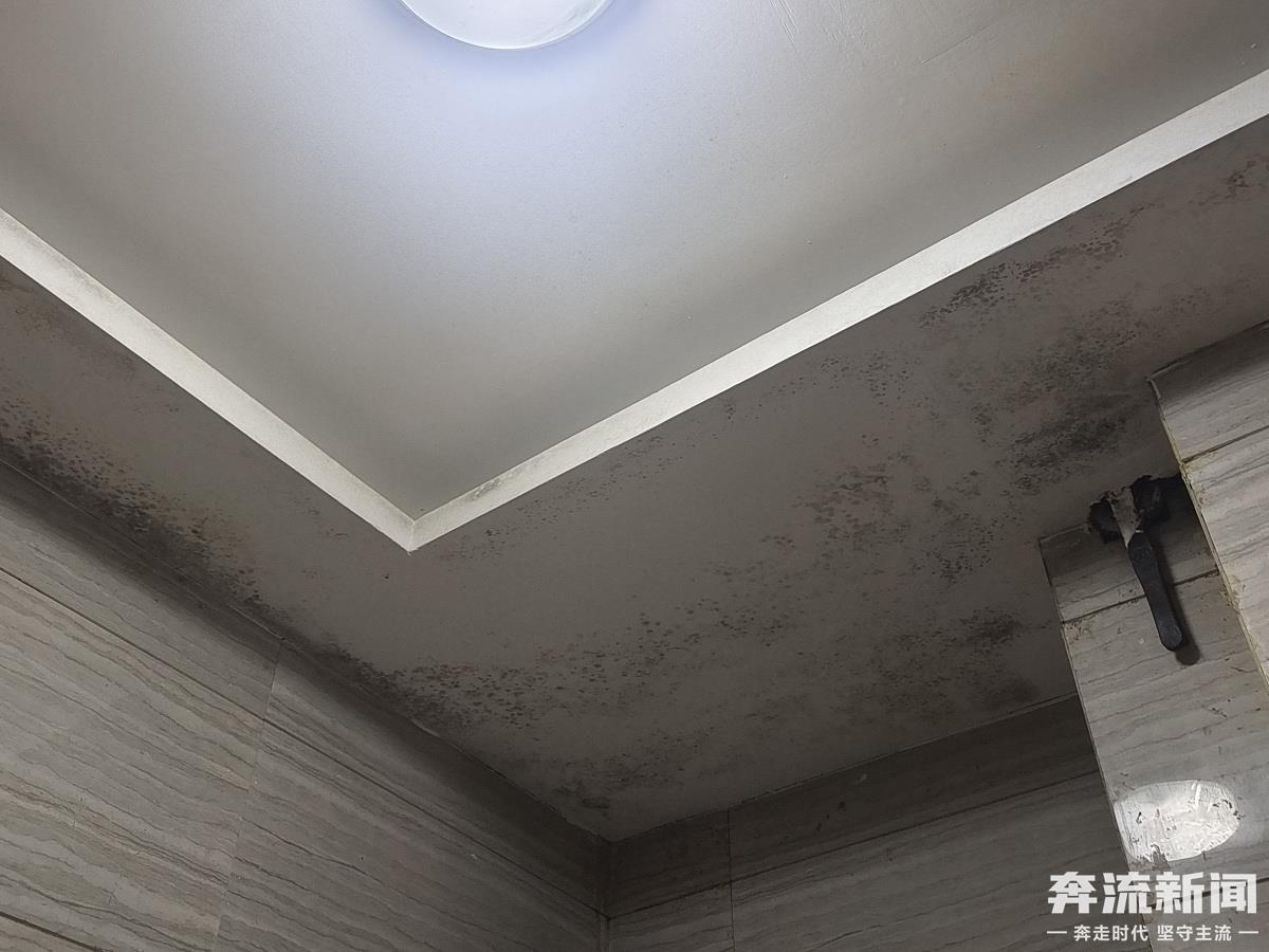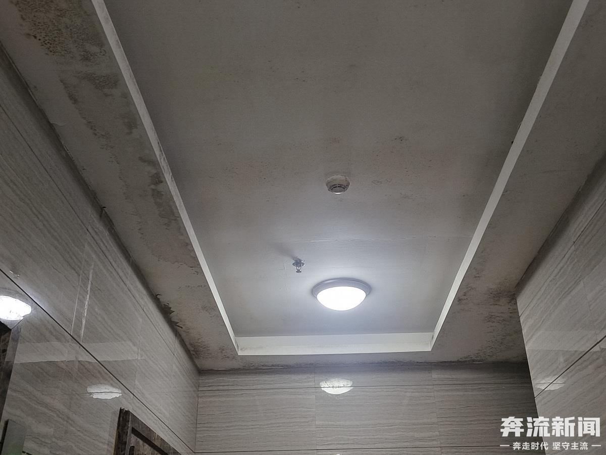 3月30日上午,奔流新闻记者来到鹏博·金城珑园。在1号楼4单元电梯间内,只见电梯上方及侧面的墙面、顶棚分布着很多黄色和黑色的霉斑,隐隐能闻到霉烂味。等待电梯的梁女士向记者表示,这家牛肉面馆是2024年5月开业的,电梯前厅与面馆相邻。