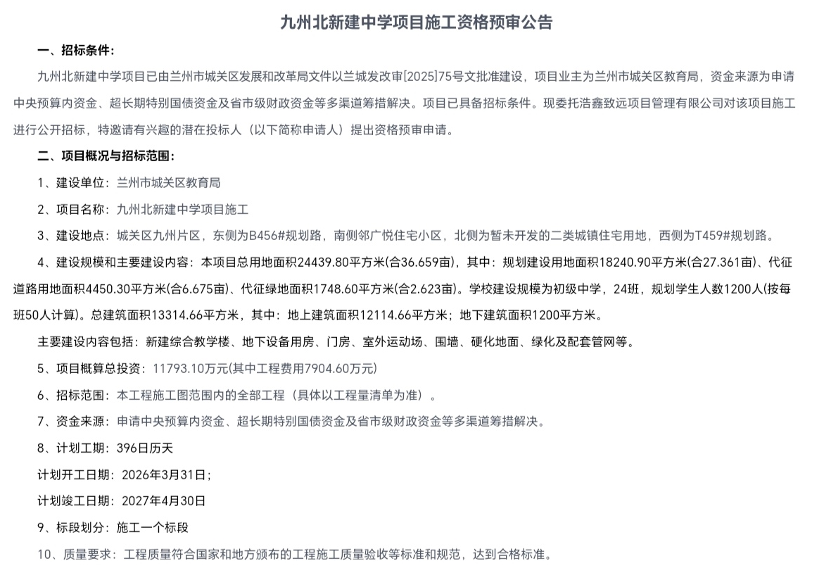 奔流新闻讯(首席记者 张鹏翔)近日,备受关注的兰州九州北新建中学项目迎来关键进展。兰州市公共资源交易中心发布该项目施工资格预审公告,标志着这一民生工程正式进入全面建设阶段。项目概算总投资约1.18亿元,计划于2026年3月31日开工,2027年4月30日竣工。