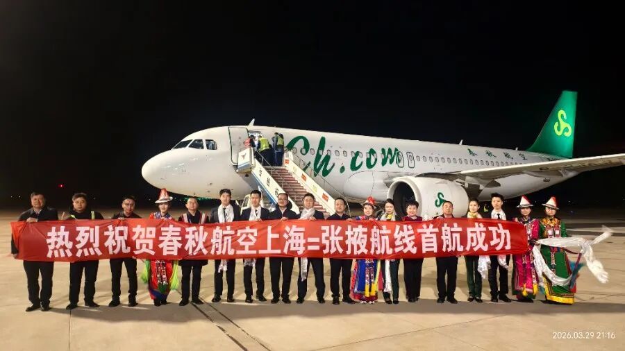 3月29日20点53分,伴随着春秋航空9C8697航班平稳降落,标志上海=张掖直飞航线成功首航,这是张掖机场完善航线网络、助力文旅融合发展的重要里程碑。