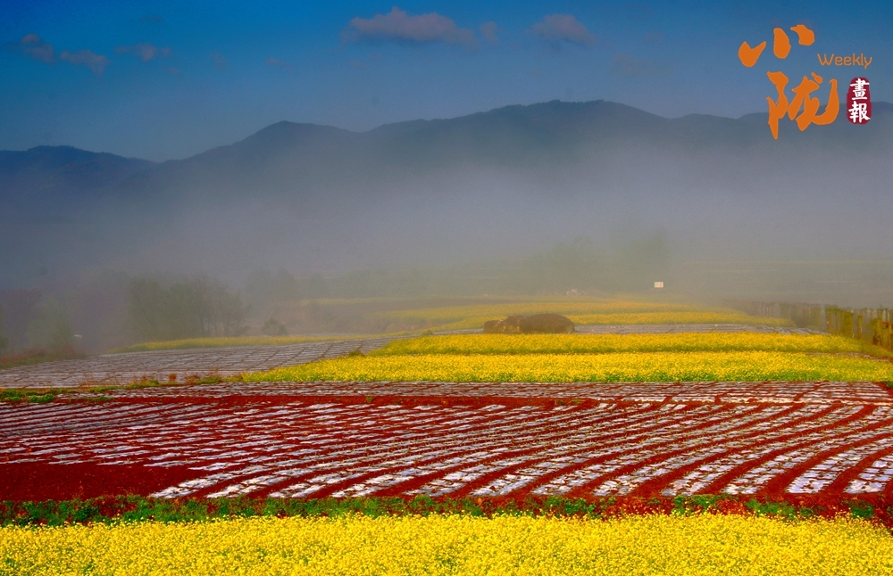 晨雾漫过山峦,梯田铺展成彩色织锦,黄花似金浪翻涌,红花如霞锦铺陈,远山含黛,天地间满是春日的鲜活与诗意。